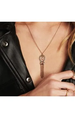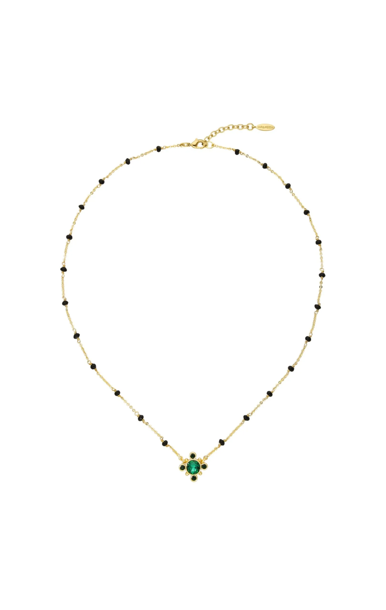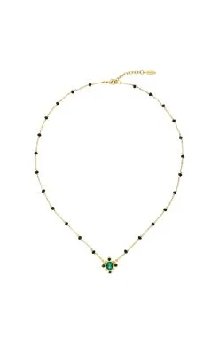 Ravissant collier monté sur une chaîne chapelet en laiton doré à l’or fin 14 carats, composée de perles de verre facettées noires. On adore l’effet petite croix revisitée de ce charm pampille au centre, composé d’un gros strass entouré de quatre petits strass assortis vert effet émeraude. C’est l’élégant petit bijou d’été, fait à la main, à adopter sans hésiter, avec la touche Hipanema, entre originalité et raffinement.