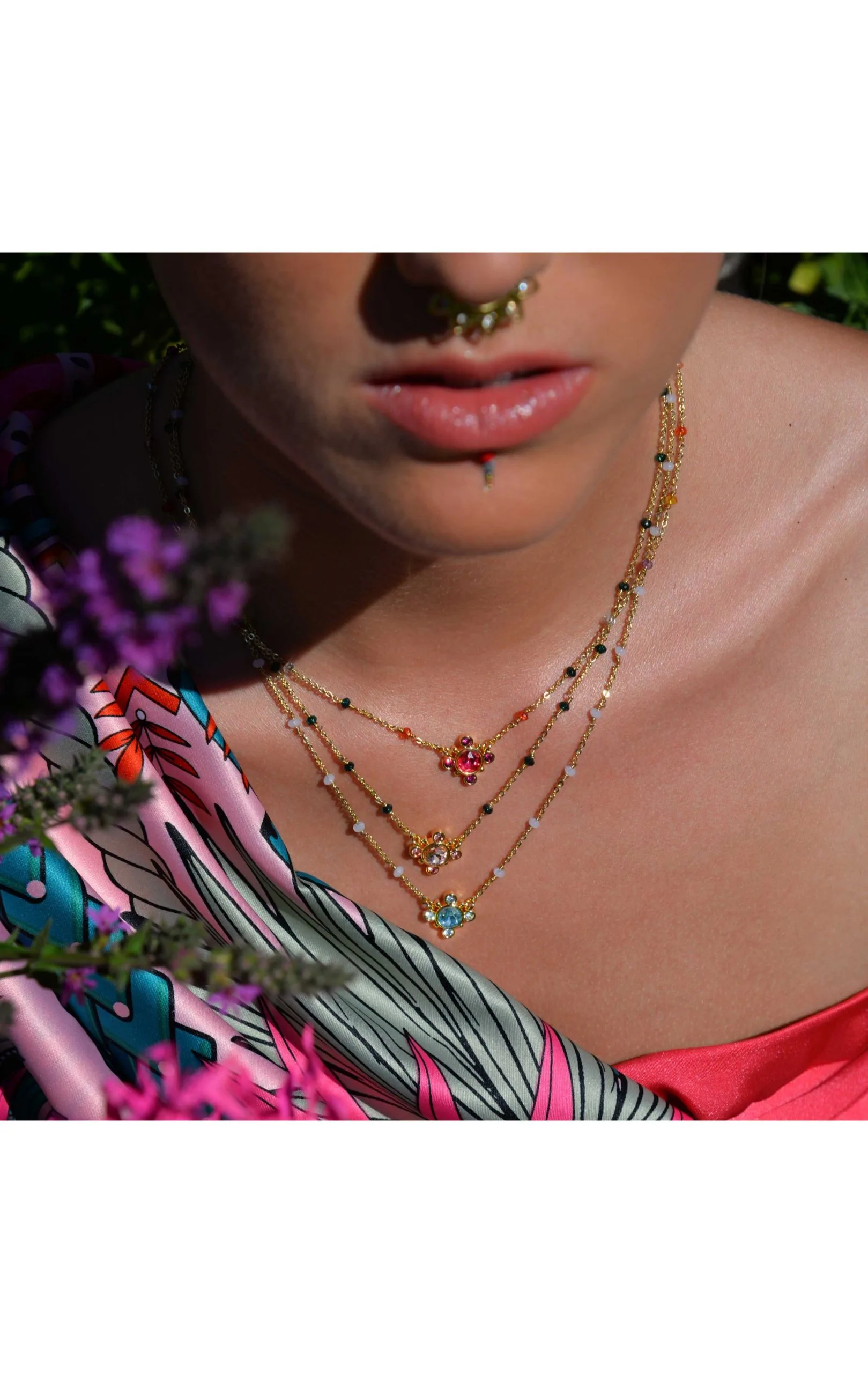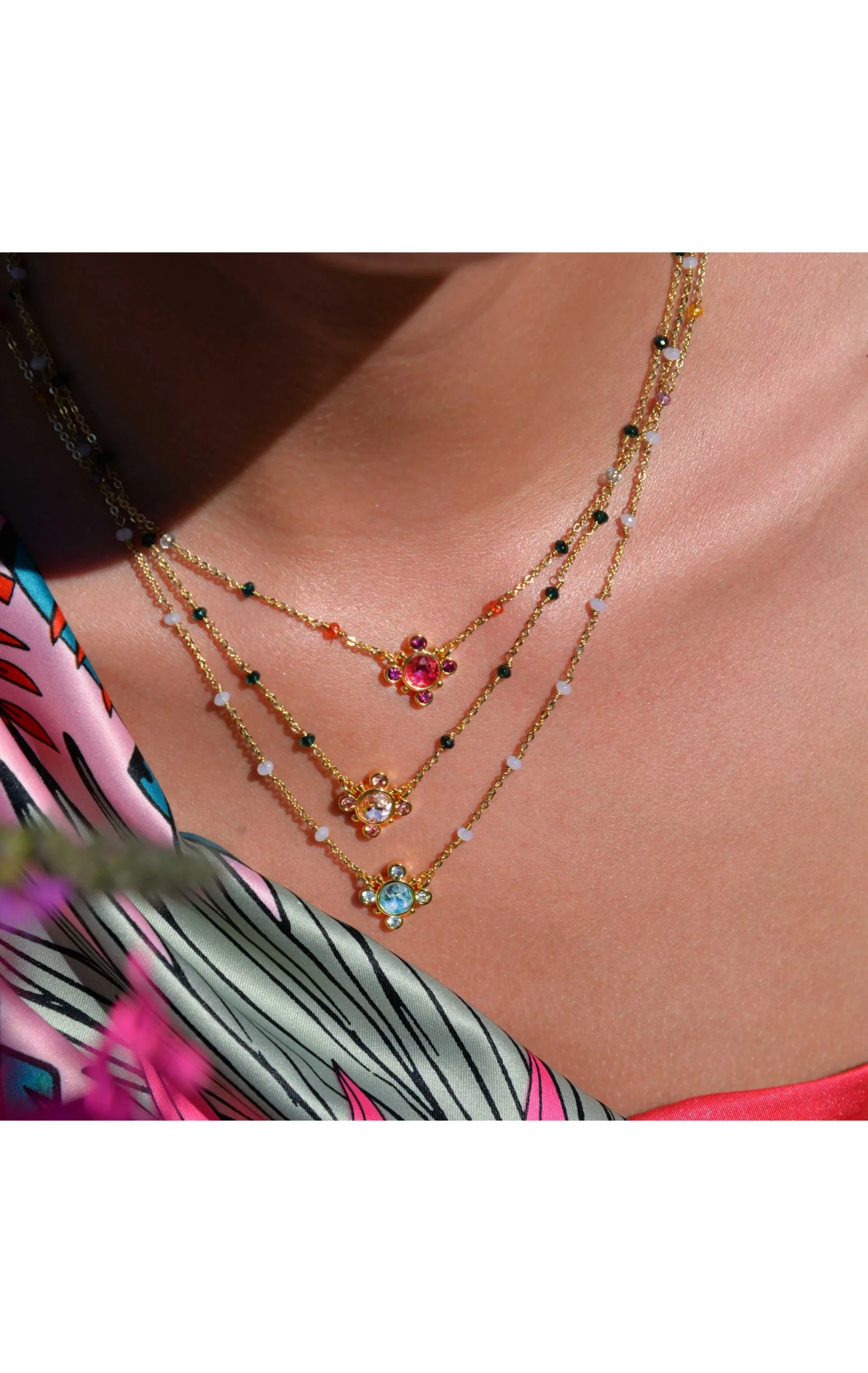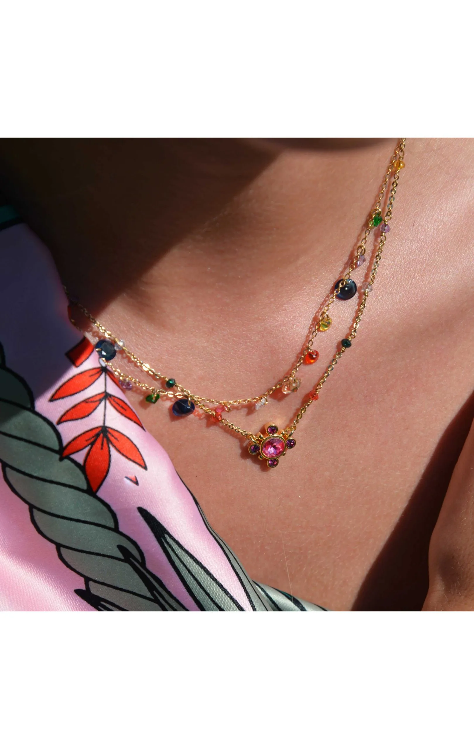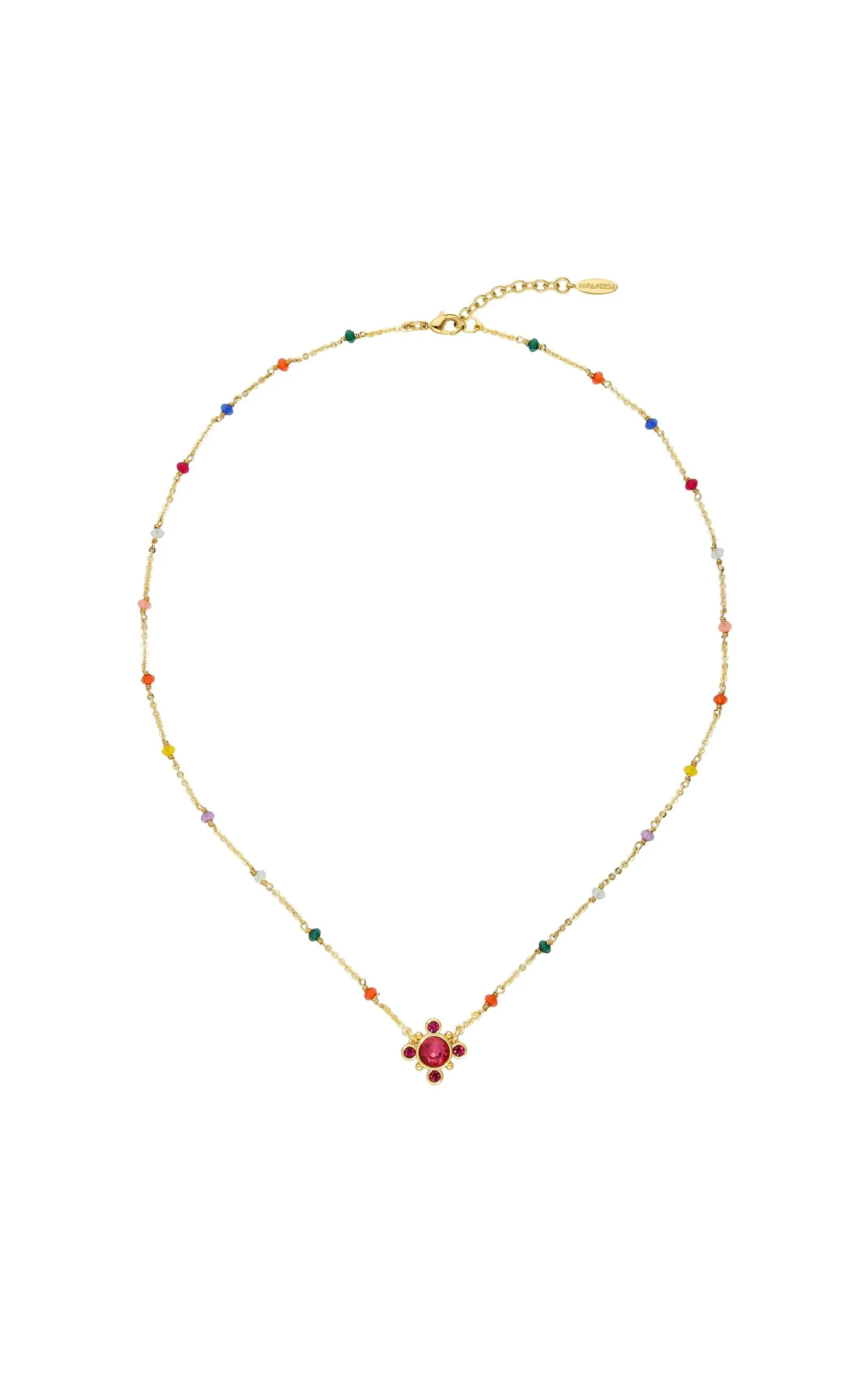 Ravissant collier monté sur une chaîne chapelet en laiton doré à l’or fin 14 carats, composée de perles de verre facettées multicolores. On adore l’effet petite croix revisitée de ce charm pampille au centre, composé d’un gros strass entouré de quatre petits strass assortis fuchsia effet rubis. C’est le petit bijou d’été coloré, fait à la main, à adopter sans hésiter, avec la touche Hipanema, entre originalité et raffinement.