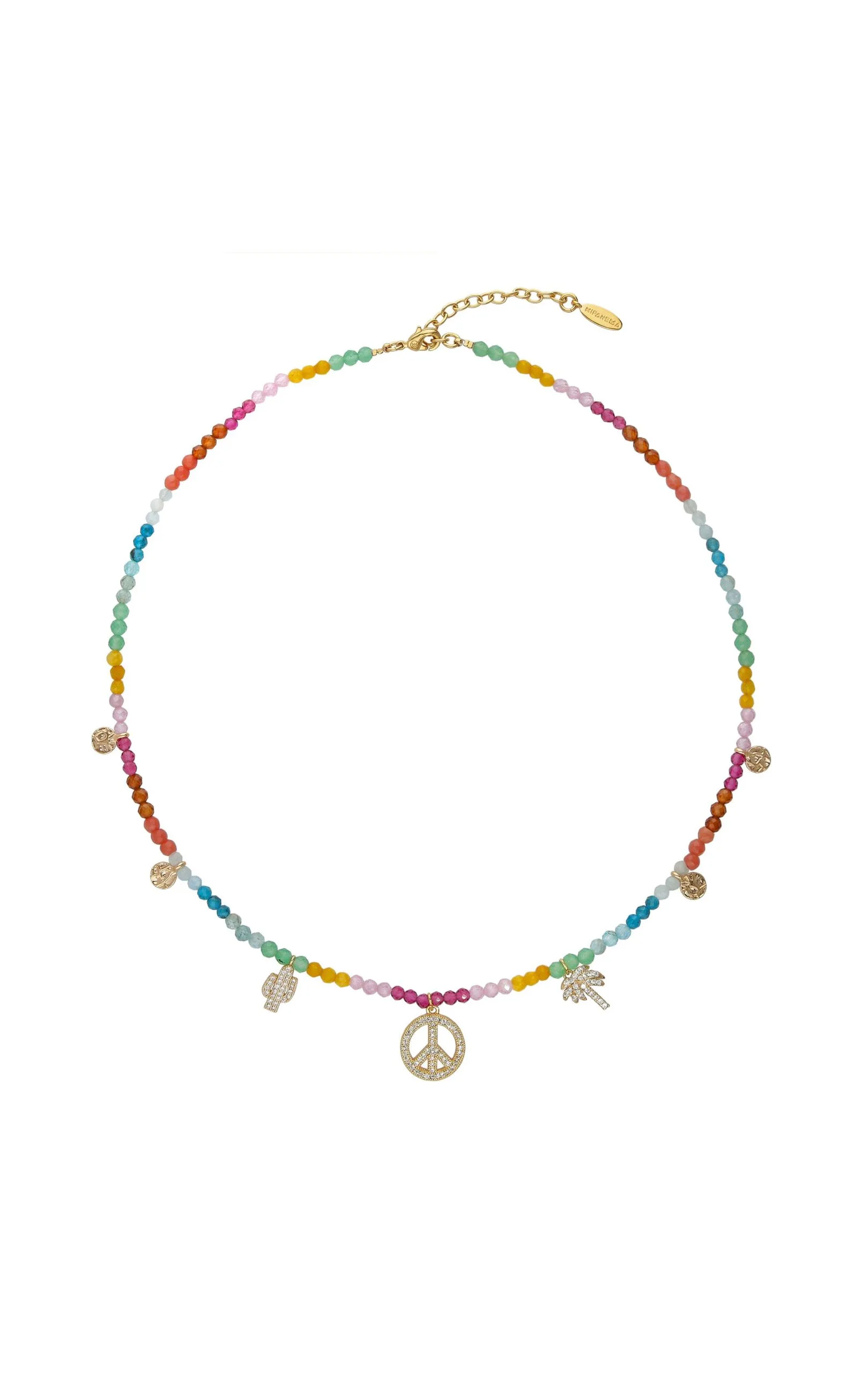 Collier fin doré à l’or fin 14 carats. Il est composé de petites perles facettées très colorées dans les tons bleu turquoise, vert d’eau, jaune, rose pâle, fuchsia et corail. Vous allez adorer les 5 petites pampilles en forme de palmier, de cactus, de sigle Peace and love ou de piécette qui assurent à cette pièce un caractère Gypsy pour cet été !