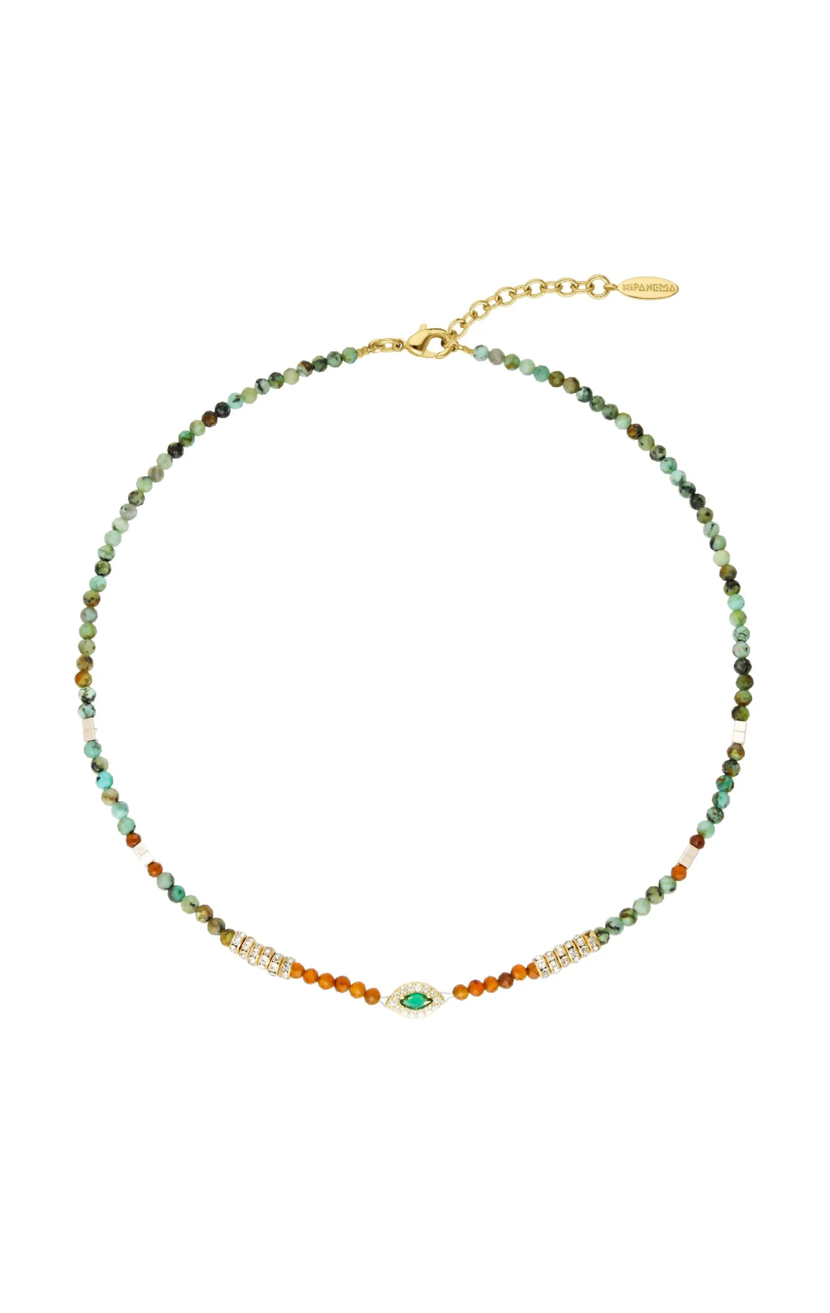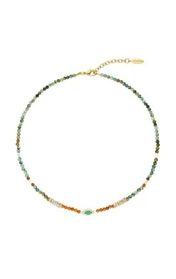 Ravissant collier doré, monté sur un rythme symétrique de perles de verre et pierres semi-précieuses colorées, dans des tonalités turquoise et bambou de mer rouge orangé. Au centre, un cabochon oval travaillé orné d’une pierre verte effet émeraude. On aime le rendu ethnique chic raffiné et joyeux pour ce bijou fait à la main.