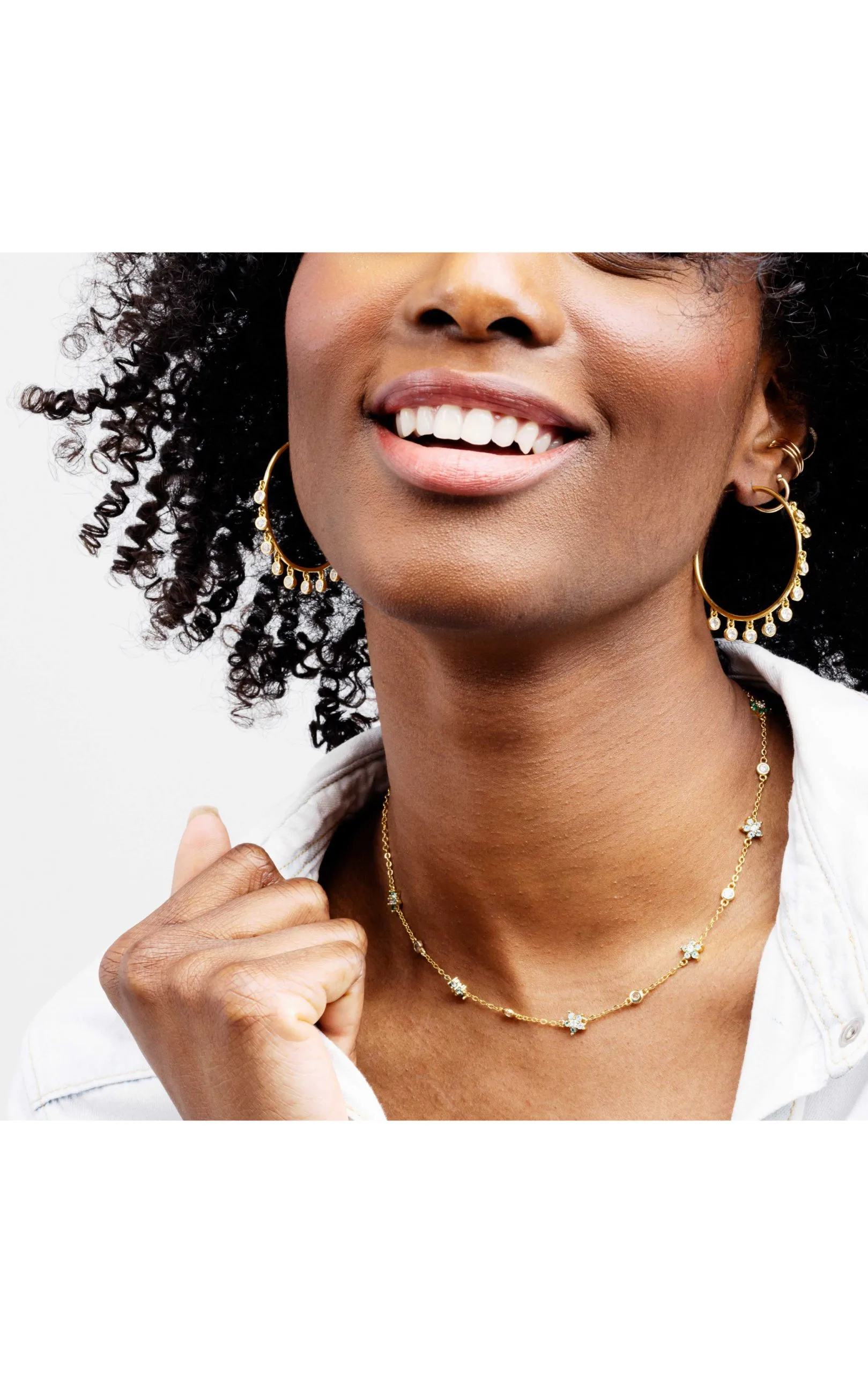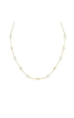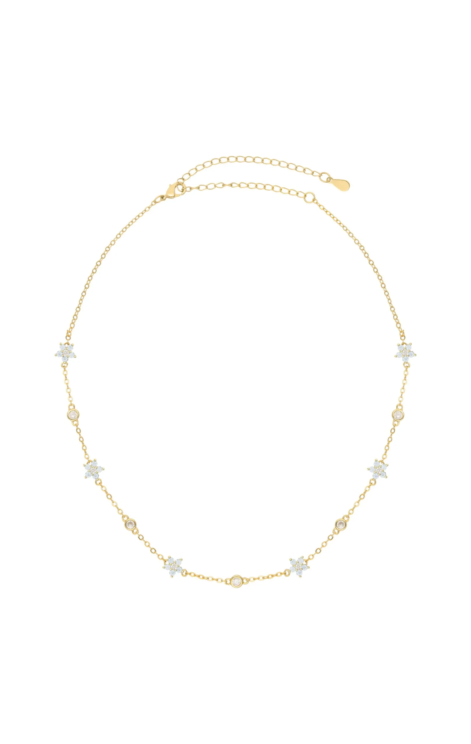 Collier doré à l’or fin 14 carats, sur une chaîne forçat ras de cou, orné de petites fleurs marguerites pavées de strass effet diamant, en alternance avec des petits ronds en strass effet diamant. Idéal pour un look romantique.