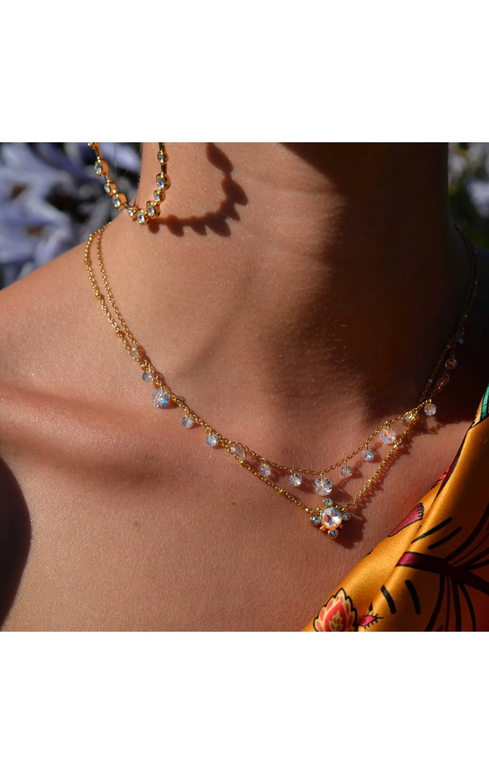 Ravissant collier d’inspiration Hollywood-Bollywood, avec une multitude de strass non sertis, de tailles différentes, sur une chaîne forçat dorée à l’or fin 18 carats. On adore ce rendu cascade de pierres blanches effet diamant. Ce bijou au raffinement aérien est fait à la main.