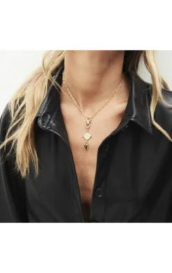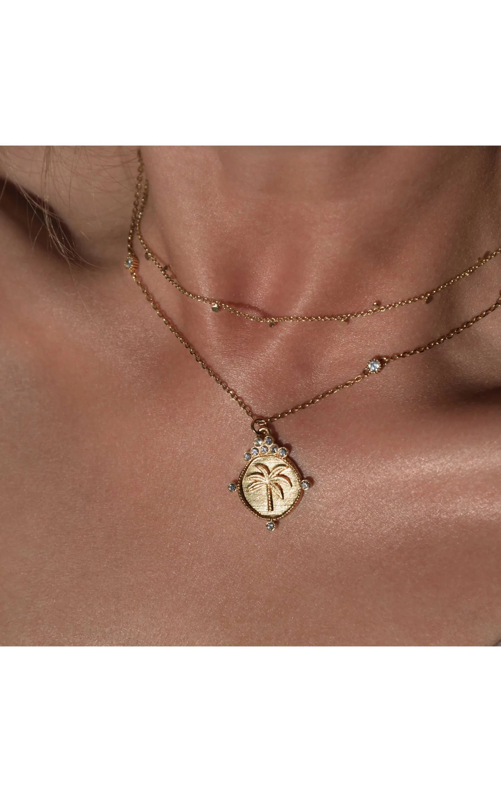 Collier doré à l’or fin 23 carats, composé d’une chaîne forçat un peu épaisse ouvragée avec huit petits cabochons ronds effet diamant. En son centre, une élégante médaille tout en panache avec cette pièce palmier ouvragée, entourée de strass effet diamant. Ce bijou est fait à la main.