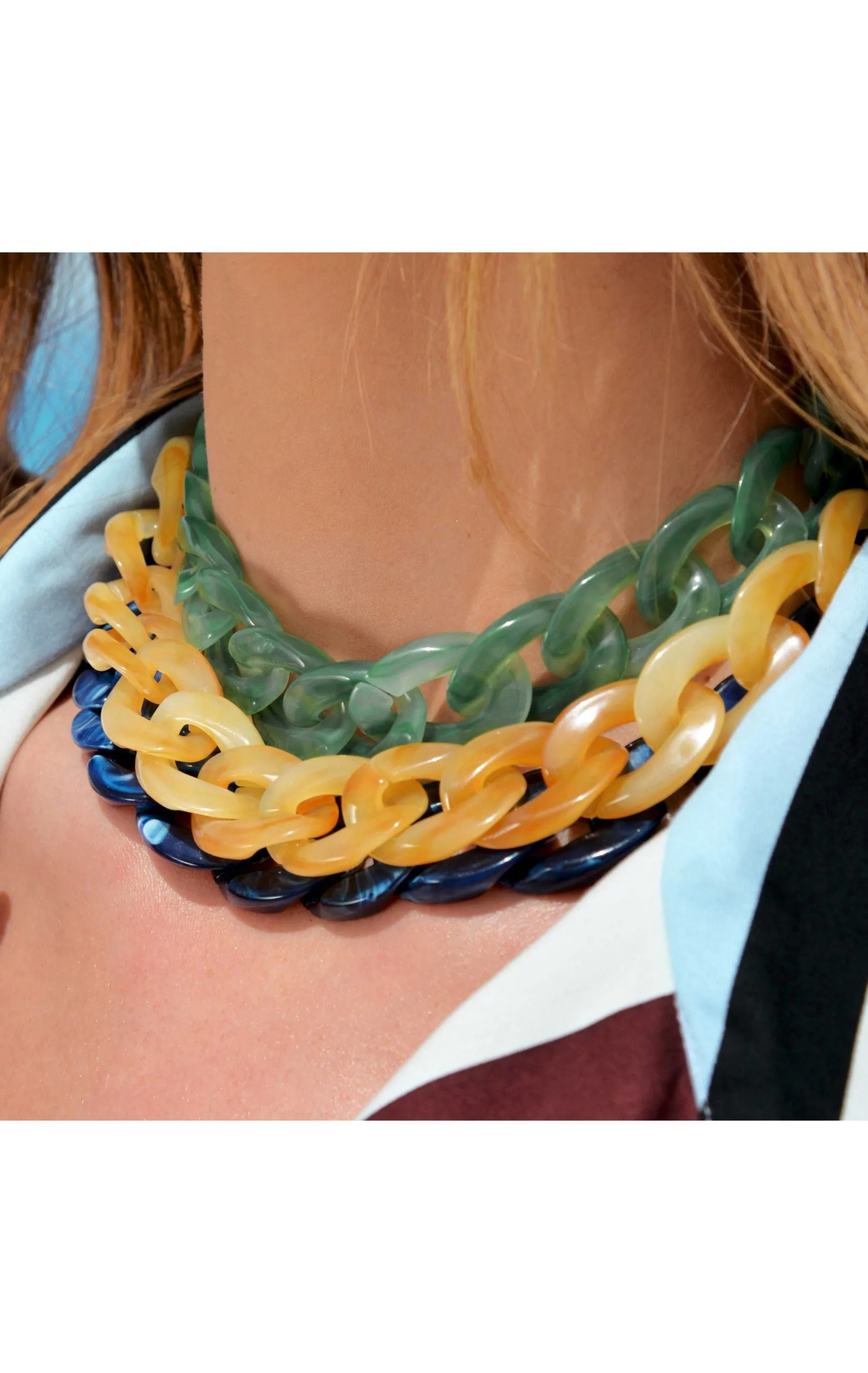 Osez le look XXL avec ce collier aux maillons en acrylique oversize colorés. On adore ce look minimaliste, avec juste la présence d’un gros bijou sur le décolleté. Cette maille gourmette revisitée version maxi et colorée est la tendance de la saison, alors n’attendez plus et vous aussi osez le collier de caractère que tout le monde convoitera.