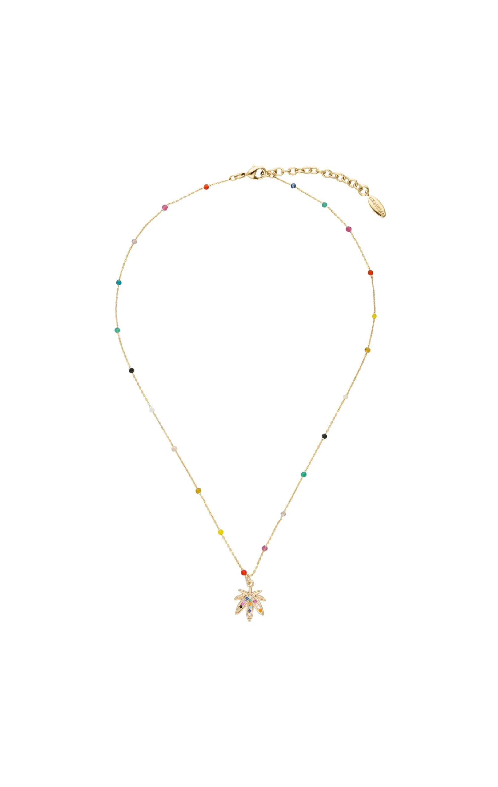 Collier ras de cou monté sur une ravissante chaîne chapelet très fine, dorée à l’or fin, avec de petites perles multicolores. Au centre, une petite palmette, feuille de cannabis, pavée de strass multicolores. Avec ce bijou fait à la main, Hipanema revisite le look baba cool, hippie chic.