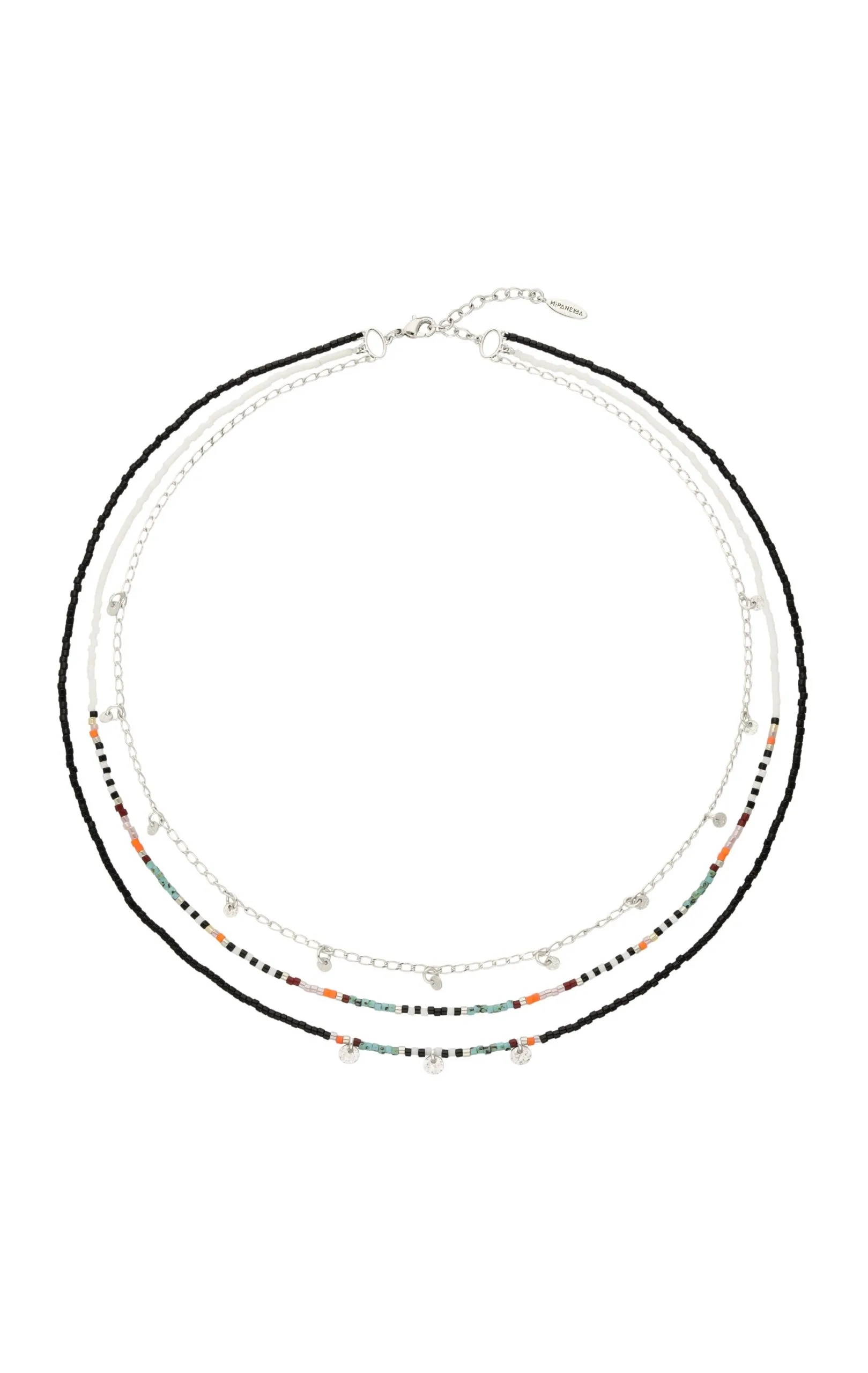 Collier ras de cou composé de trois liens: une première chaîne plus courte plaquée argent ornée de sequins, un deuxième lien en perles de rocaille Miyuki, dans des tons rose, corail, noir, blanc et turquoise, suivie d’une dernière chaîne avec une majorité de perles noires. Au centre, sur un rythme assez court, l’on découvre des perles colorées dans les mêmes tonalités (rose, turquoise, noir et blanc), ornées de trois sequins argentés. Ce bijou de toute beauté d’inspiration ethnique chic, à porter seul ou en accumulation, est fait à la main.