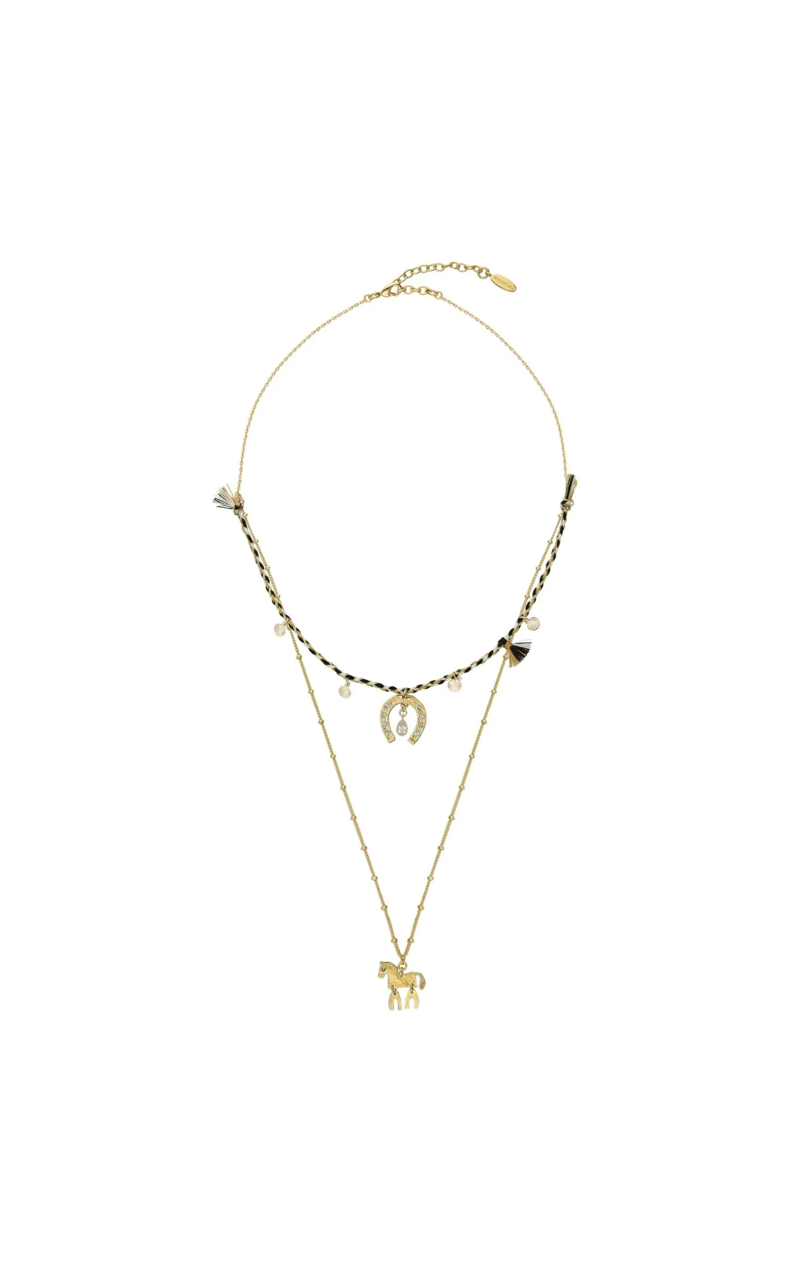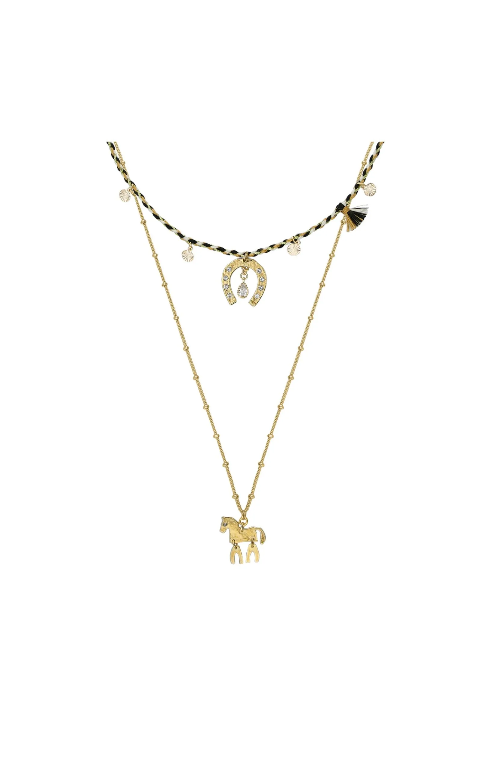 Adoptez un look gypsy plein d’élégance cet hiver! Vous allez adorer ce collier double rang doré à l’or fin 14 carats. Le premier lien est une tresse délicate dans les tons noir, caramel, beige et doré, ornée de petites pampilles dorées et d’un fer à cheval pavé de strass effet diamant en son centre, qui vous portera bonheur. Le deuxième lien est une chaîne qui est ornée en son centre d’un petit cheval articulé à l’oeil déclicatement orné d’une petite pyrite. Un collier ethnique chic ayant la singularité de mêler les genres et les matières.
