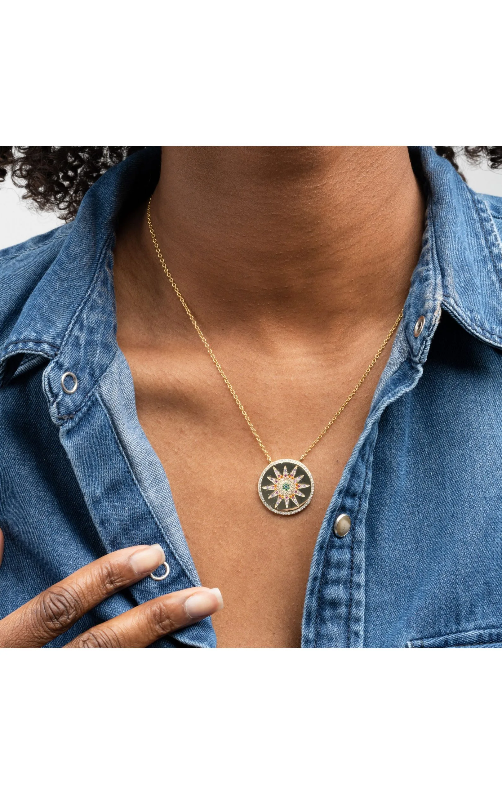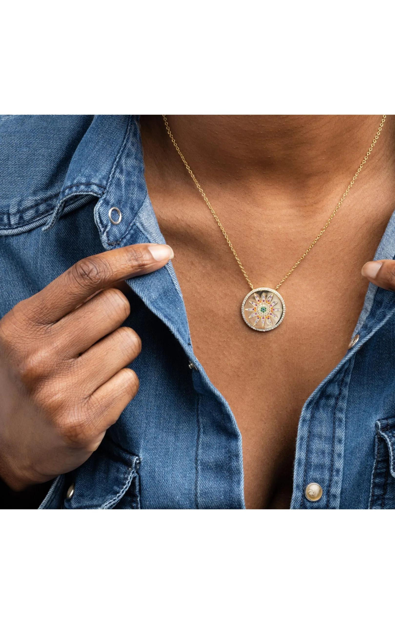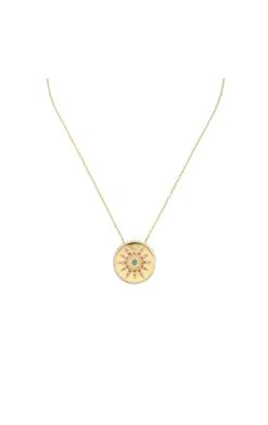 Collier ras de cou doré à l’or fin, composé d’un médaillon effet soleil multicouleurs avec pierres violet effet améthyste, rouge effet rubis, vert effet émeraude. Pavage de strass tout autour, moulé sur une chaîne forçat. Le collier parfait pour l’été, avec son médaillon effet pentacle, très solaire, pour un rendu joaillerie bohème d’inspiration Ibiza.