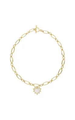 Collier au raffinement baroque avec sa chaîne à grosse maille rectangulaire et ronde, dorée à l’or fin 18 carats. Elle est ornée en son centre d’un médaillon cœur travaillé, orné de billes dorées, serti d’une résine blanche effet nacrée. Le bijou au grand cœur pour déclarer votre flamme, célébrer l’être aimé, vous parer d’amour et de beauté.