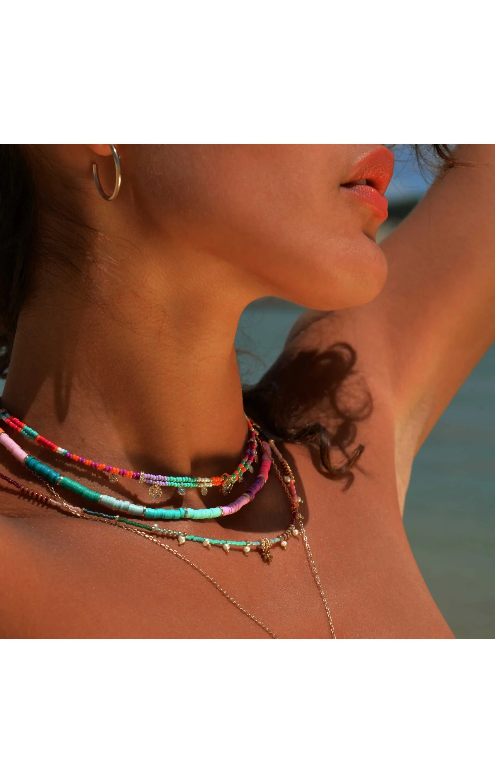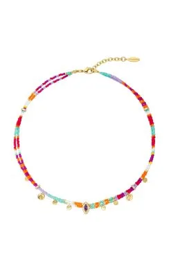 Coup de cœur garanti pour ce collier haut en couleurs! Il reprend tous les codes ethniques chics chers à Hipanema, avec son tissage en perles réalisé à la main, jouant sur un montage de perles en verre colorées, dans des tonalités de turquoise, fuchsia, violet, orange, bleu. Bracelet porte-bonheur, il se mue en objet précieux avec son cabochon central doré travaillé orné d’une pierre violette effet améthyste, entourée de pampilles sequins dorés. À porter seul ou en accumulation. Pour les petites et les grandes occasions.