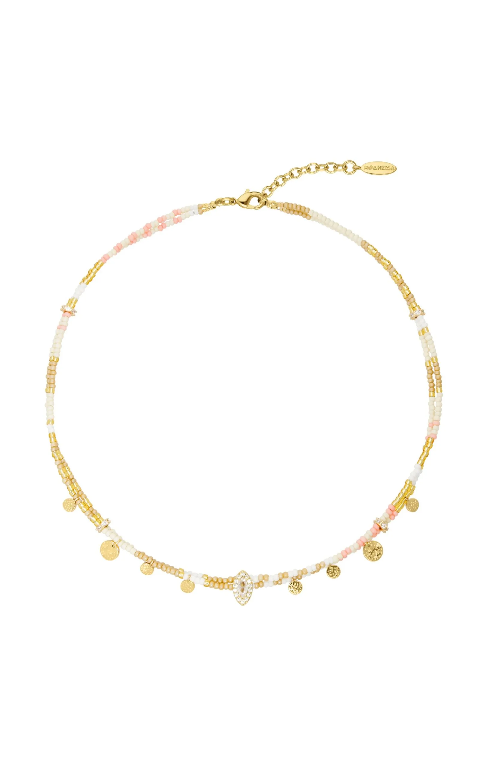 Coup de cœur garanti pour ce collier haut en couleurs! Il reprend tous les codes ethniques chics chers à Hipanema, avec son tissage en perles réalisé à la main, jouant sur un montage de perles en verre colorées, dans des tonalités de pêche, crème, baby rose, camel. Collier porte-bonheur, il se mue en objet précieux avec son cabochon central doré travaillé, orné d’une pierre cristal effet diamant, entourée de pampilles sequins dorés. À porter seul ou en accumulation. Pour les petites et les grandes occasions.