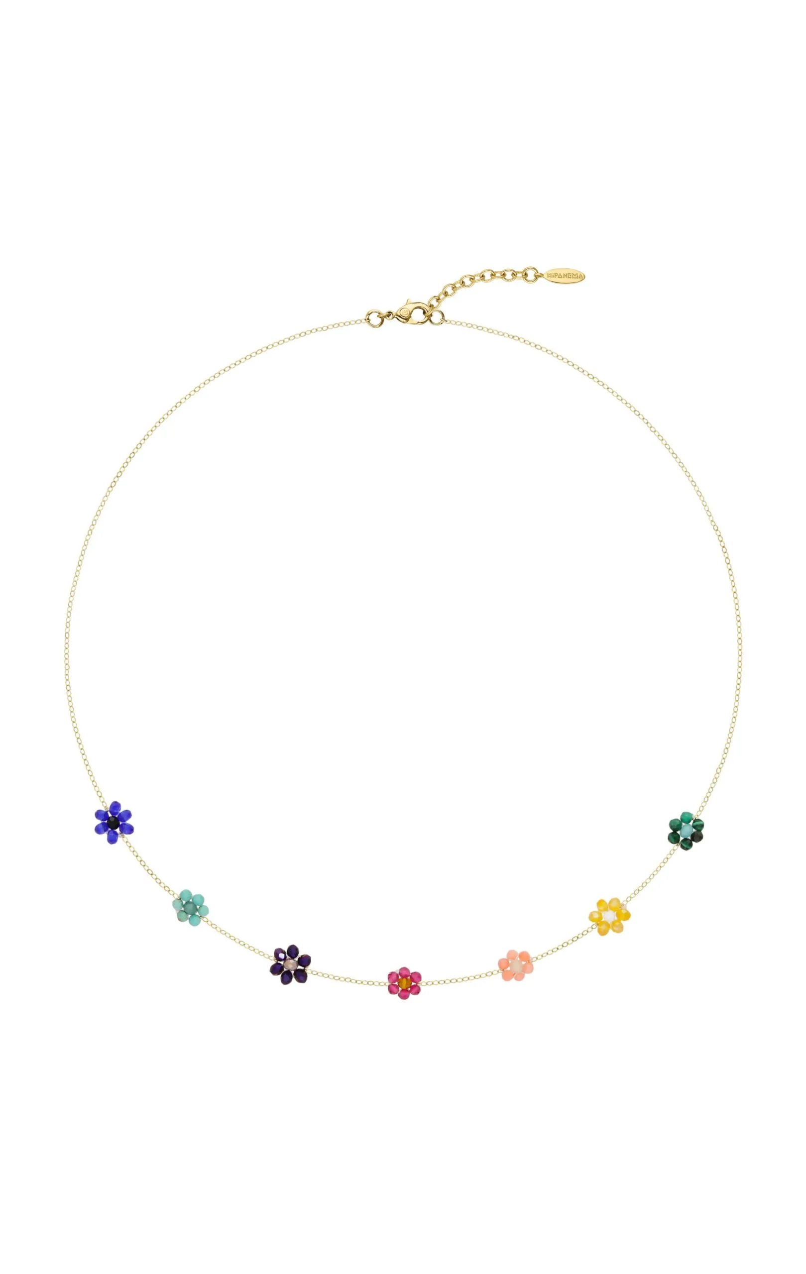 Collier ras de cou fait à la main monté sur une chaîne forçat dorée à l’or fin 18 carats, sur laquelle a été brodée sept petites fleurs multicolores, dans une élégante alternance de couleurs vert effet malachite, jaune, rose clair, fuchsia, violet et bleu effet saphir. L’allié des beaux jours pour un été sous le signe du Flower Power.