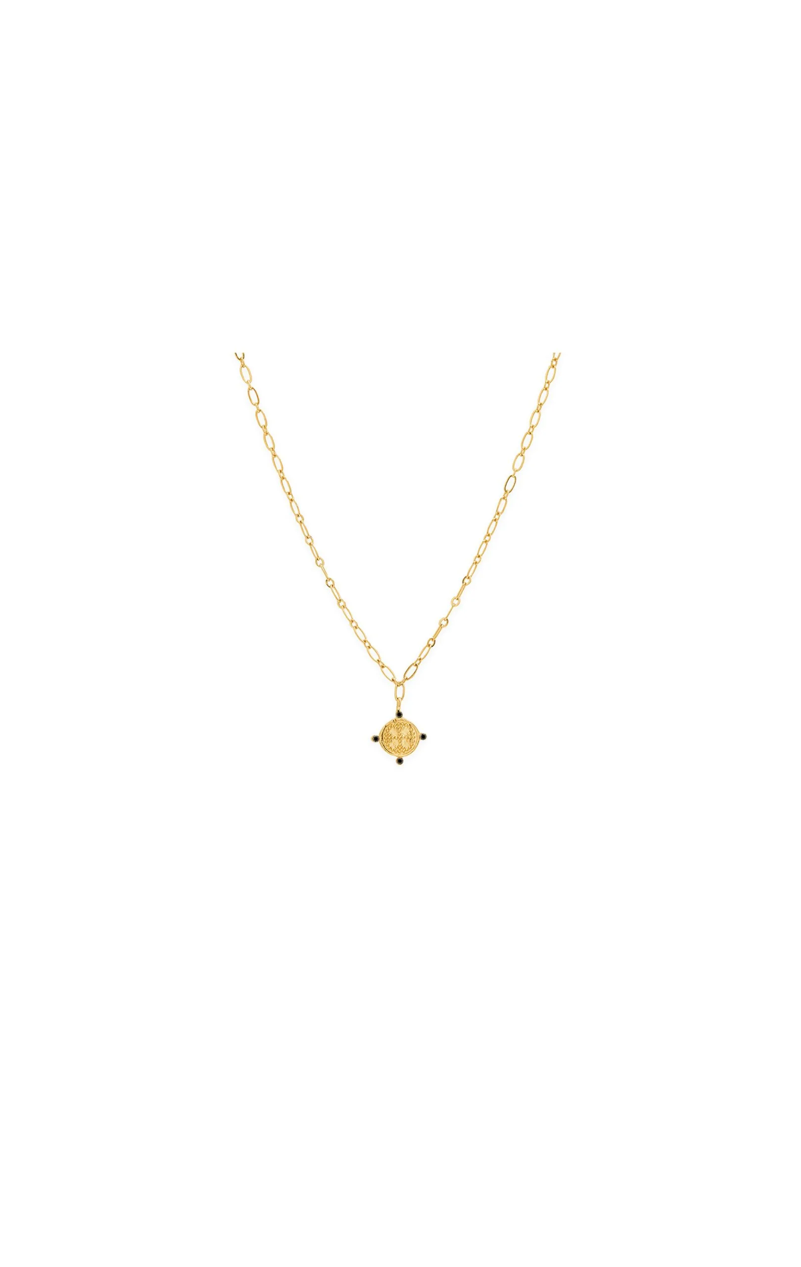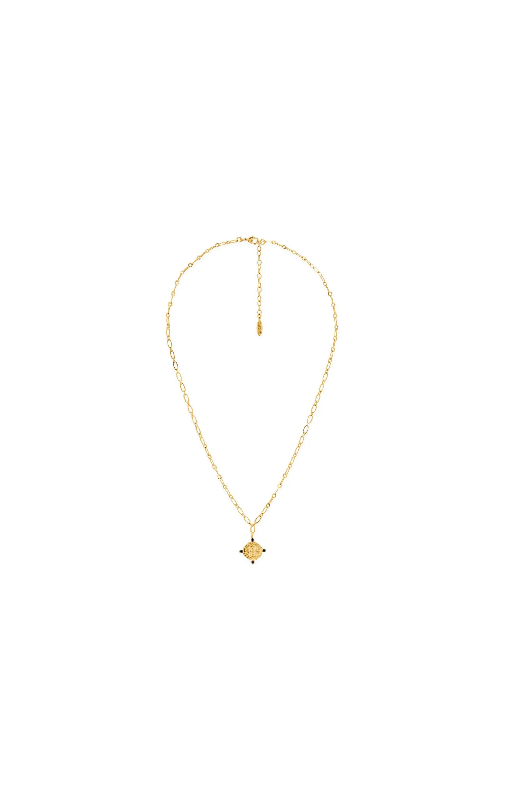 Collier mi-long doré à l’or fin 14 carats d’inspiration précolombienne, monté sur une chaîne forçat, et pendentif composé d’une pièce ouvragée ornée de cristaux.