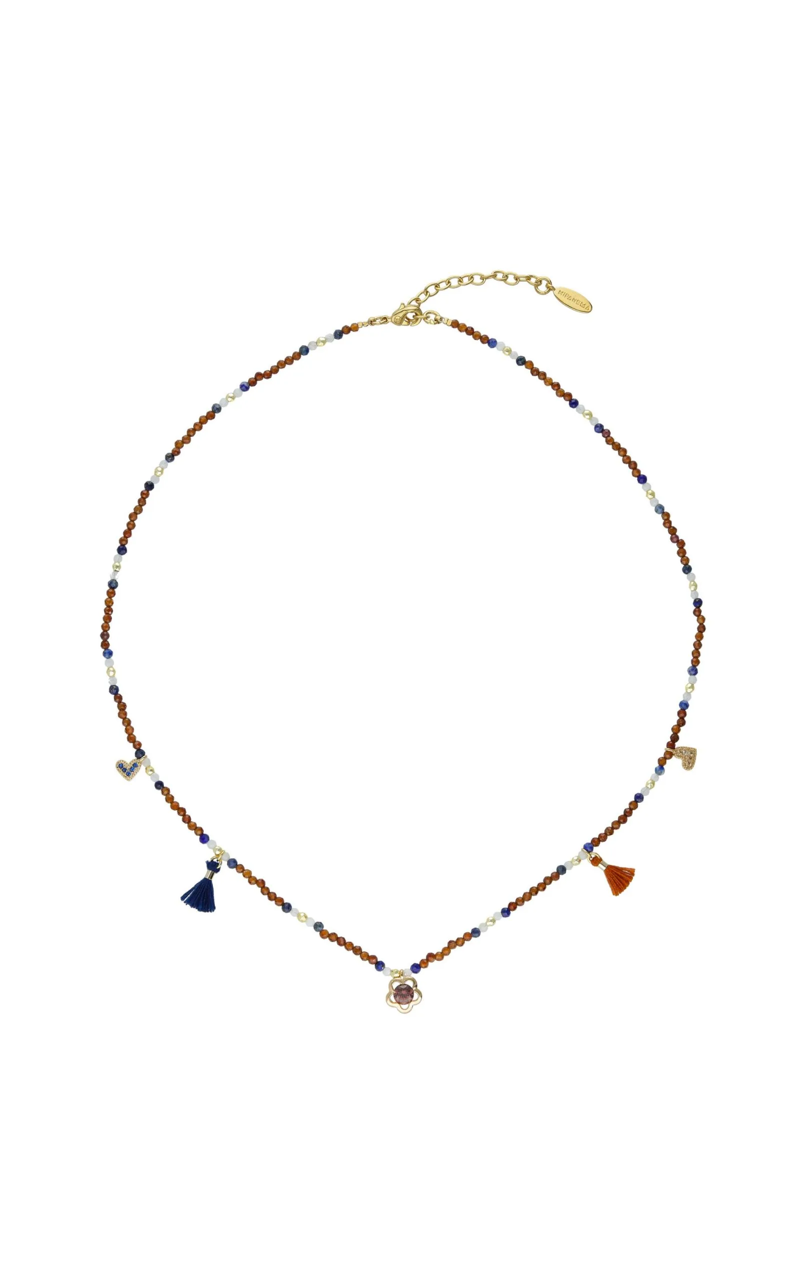 Vous aussi optez pour un style chic et ethnique à la fois! Vous craquerez pour ce collier ras de cou doré à l’or fin 14 carats. Il est composé de très petites pierres semi-précieuses de couleur ambre, bleu lapis et quartz blanc, et de cinq petites pampilles: deux petits coeurs pavés de strass, l’un de couleur bleu saphire et l’autre de couleur diamant, une petite fleur au centre ornée d’un strass couleur violet améthyste ainsi que deux petits pompons aux couleurs bleu marine et caramel, très automnales. Une pièce raffinée dans le pur style d’Hipanema.