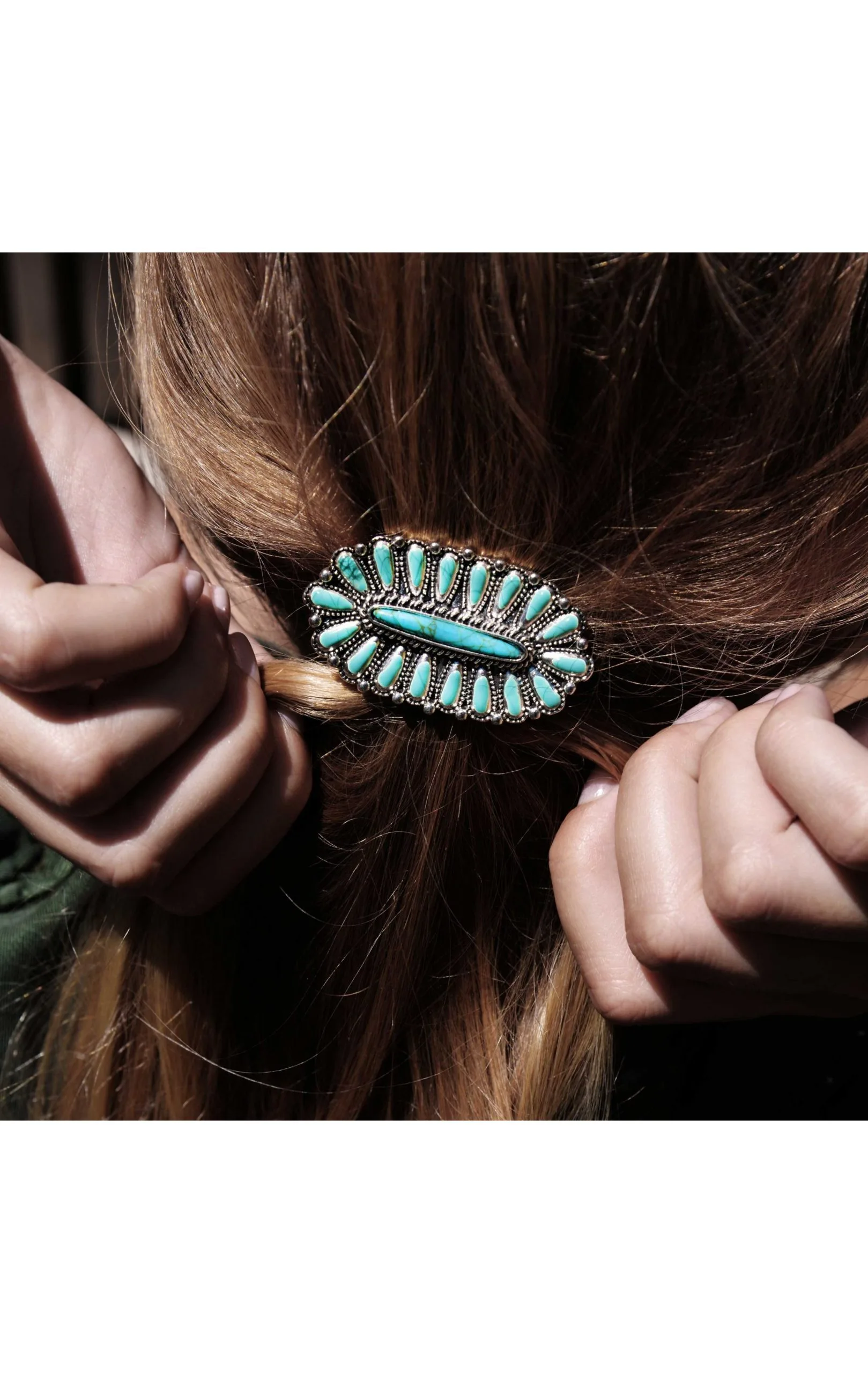 Élastique noir pour cheveux avec un cabochon argenté au centre, inspiré des tribus Zunis. On aime l’association des gouttes effet turquoise, et de l’ornement émail qui rend hommage à la délicatesse de l’artisanat Amérindien.