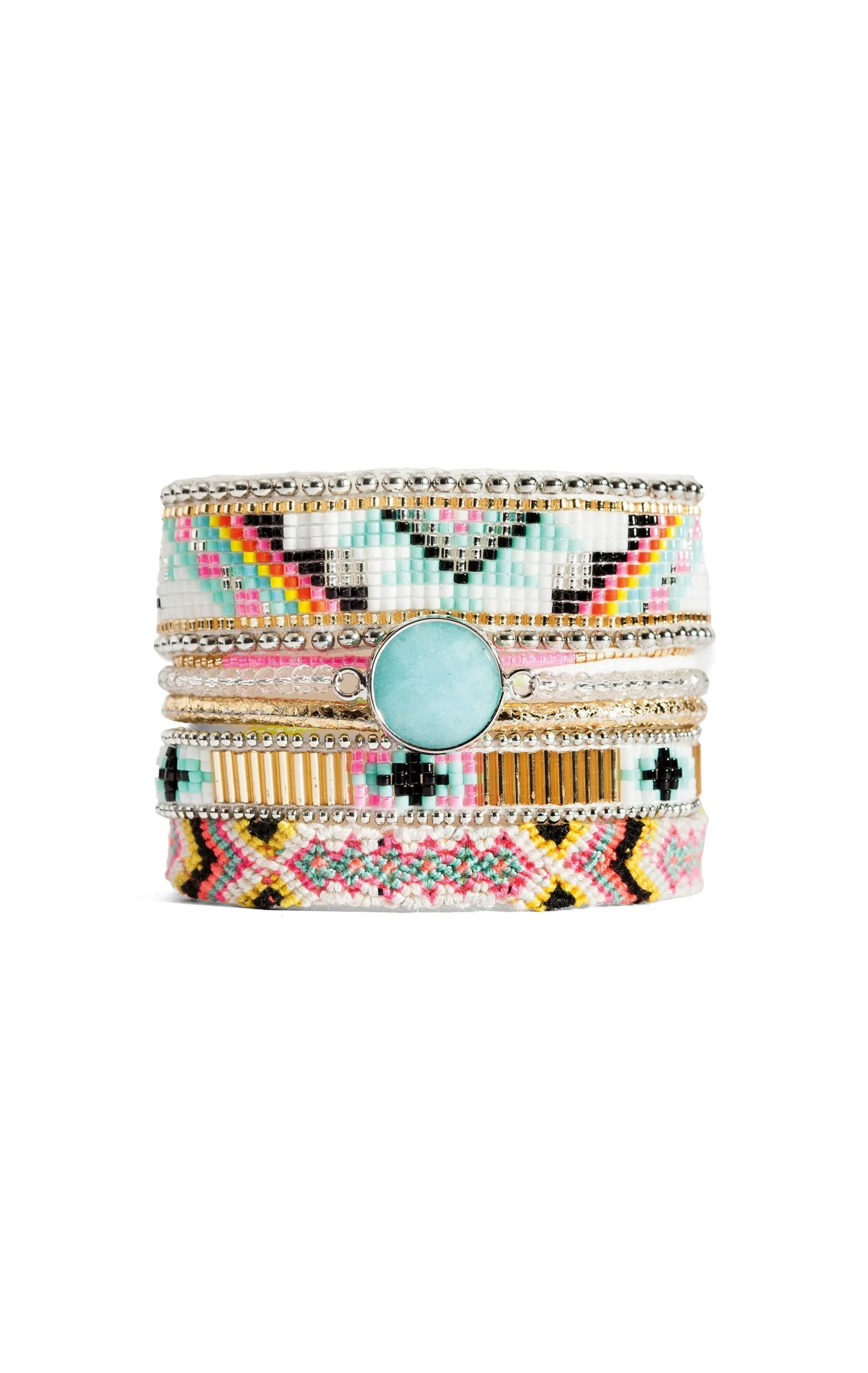 La manchette CARDAMINE est composée de liens ornés de perles dans les tons turquoise et rose et d’une pierre bleu pâle. Ses nuances douces et estivales en font le bracelet brésilien préféré des fashionistas.