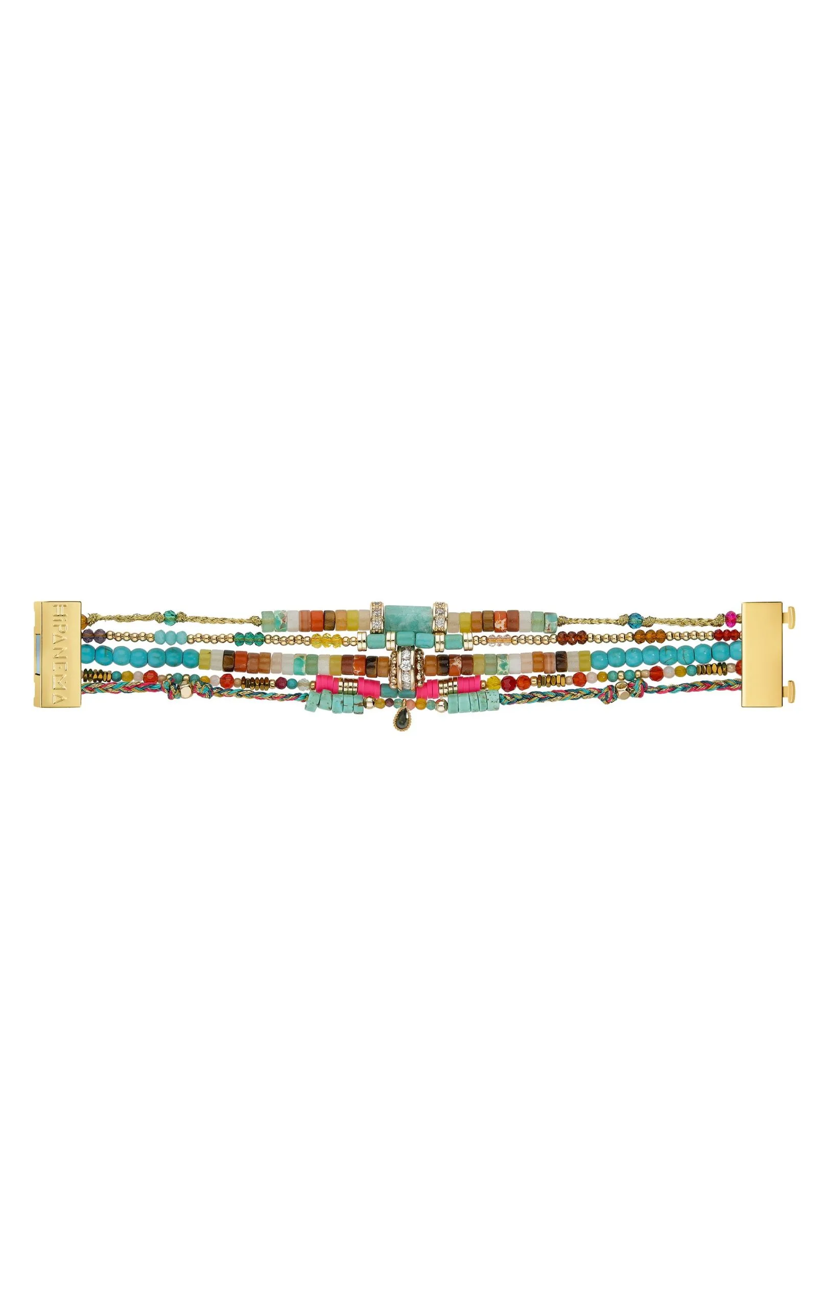 Manchette composée de cinq liens faits à la main de tressages vert, turquoise, rose, jaune et violet. On y retrouve également des pampilles dorées à l’or fin 14 carats et des strass. Un essentiel très précieux pour une saison estivale haute en couleur !