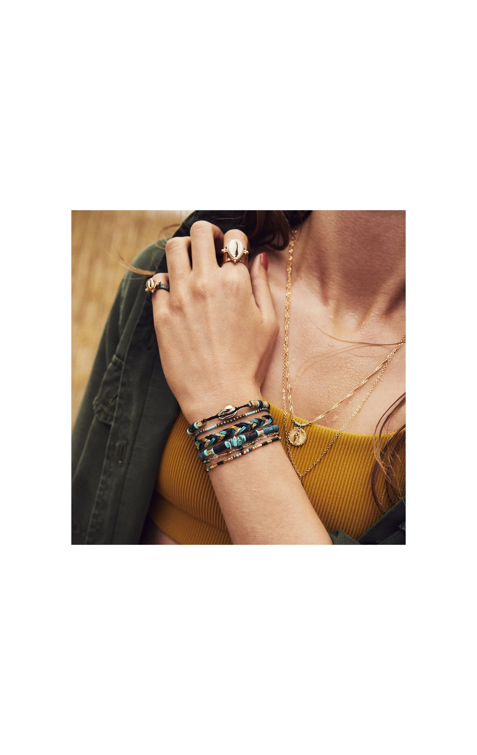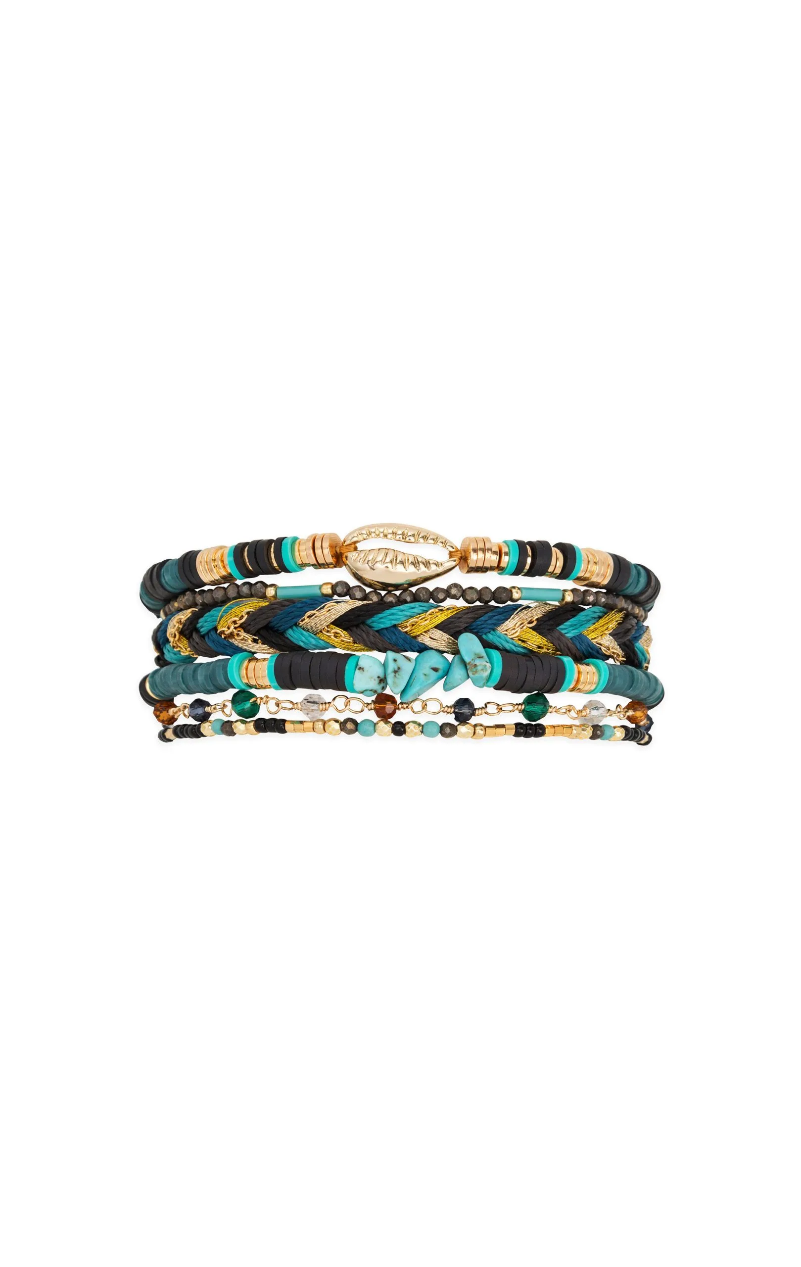 Cette manchette colorée avec un fermoir aimanté doré est composée de six liens dans les tons noirs, turquoise, vert céladon et dorés. Ce bracelet est orné de pierres semi-précieuses et de coquillages cauris naturels.