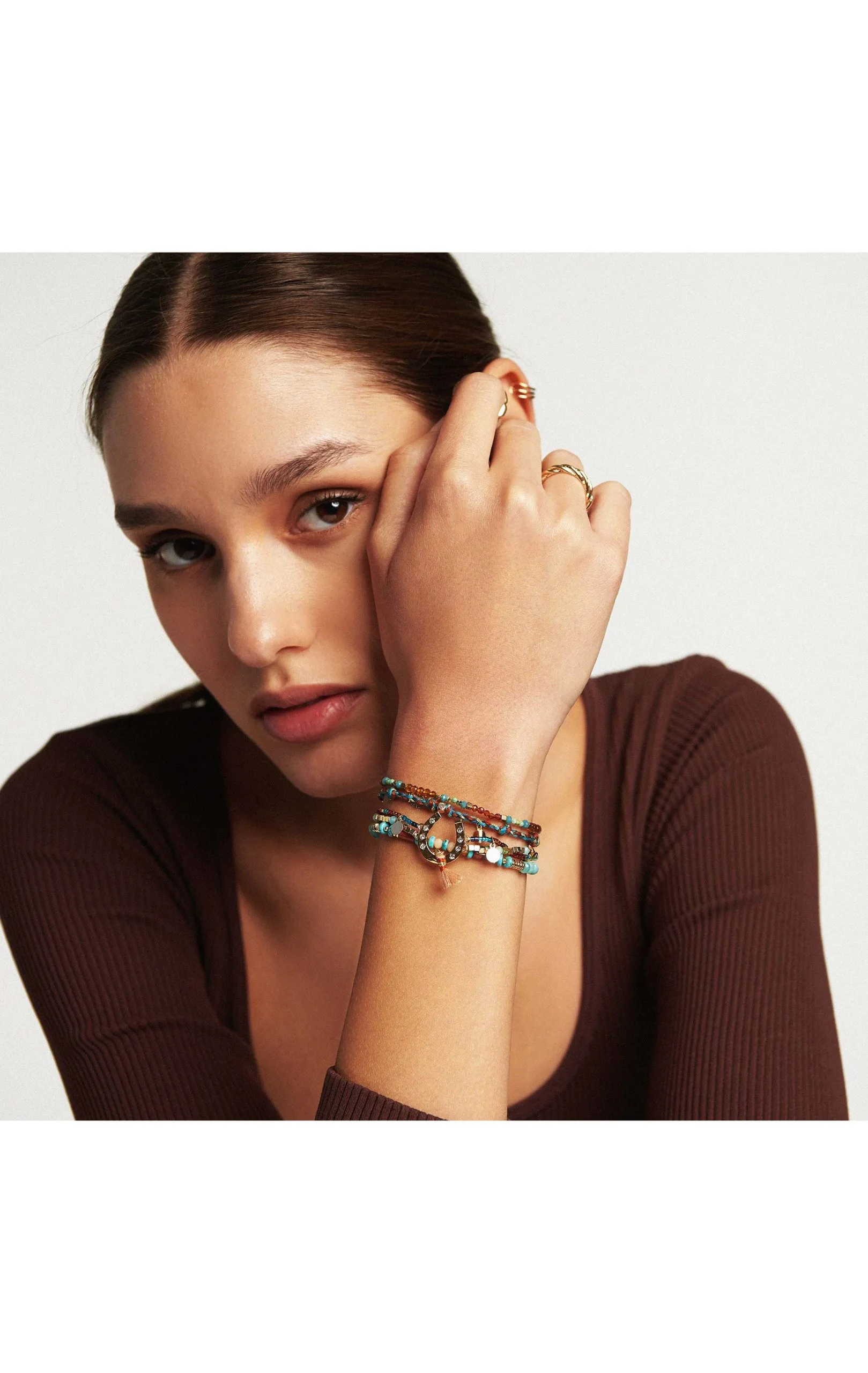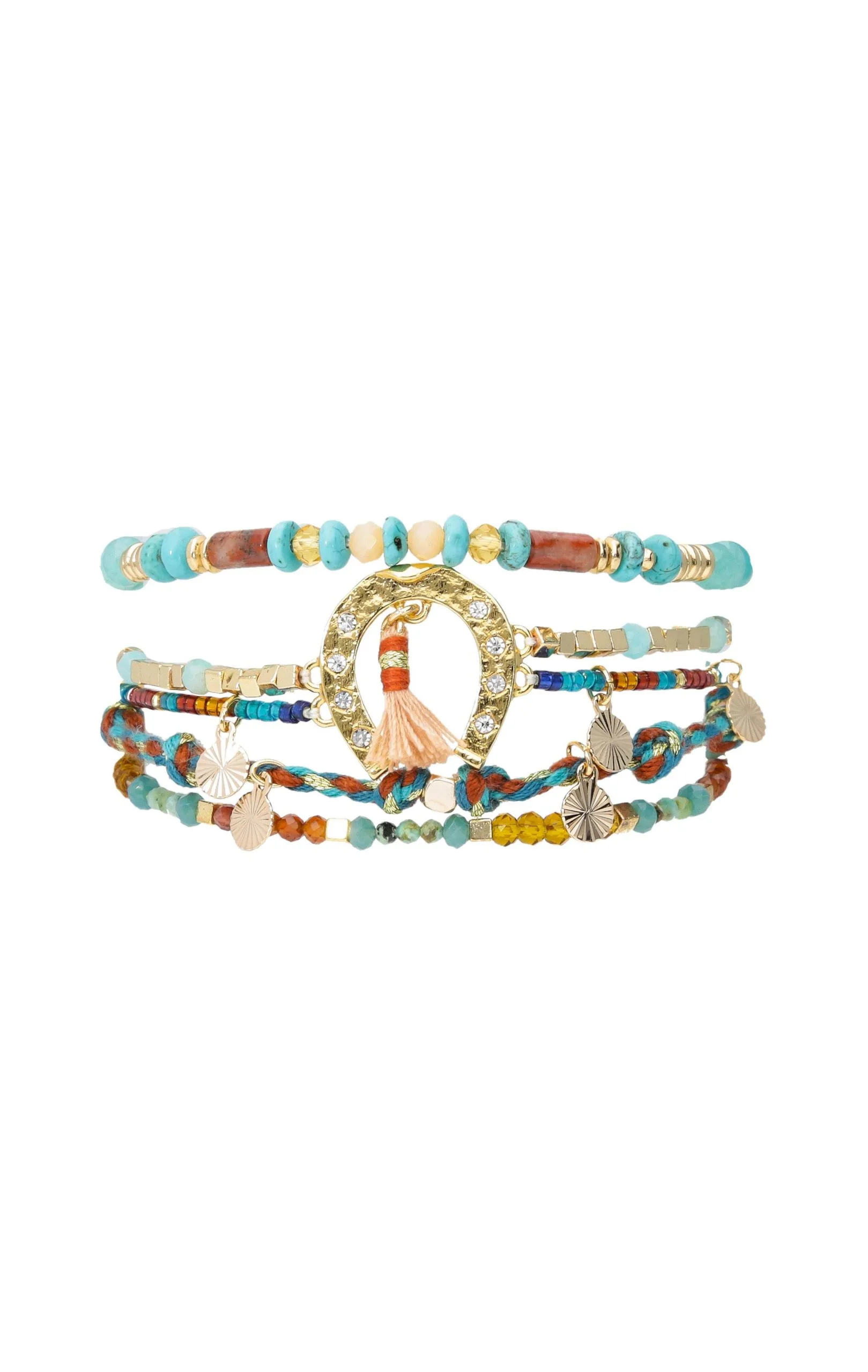 Année après année, nous vous proposons des manchettes toujours plus exceptionnelles! Ce bracelet dans les tons turquoise, rouge bordeaux, corail, et ambre est composé de six liens en pierres semi-précieuses et perles de verre réhaussées de multiples pampilles dorées à l’or fin 14 carats. Son style Navajo orné d’un fer à ceval porte-bonheur en son centre, sera votre bijou fétiche cette saison. Vous allez adorer son esprit ethnique chic.