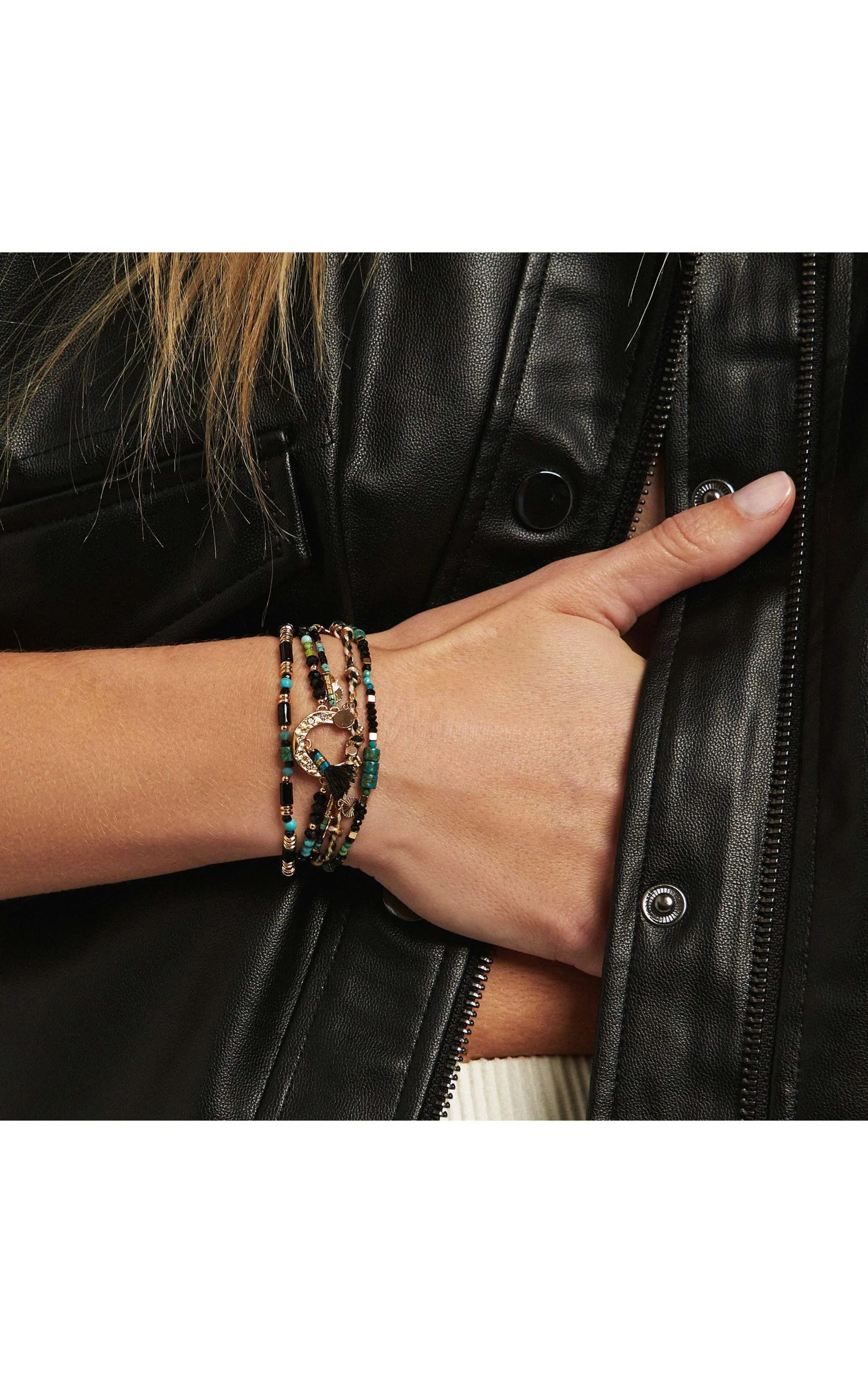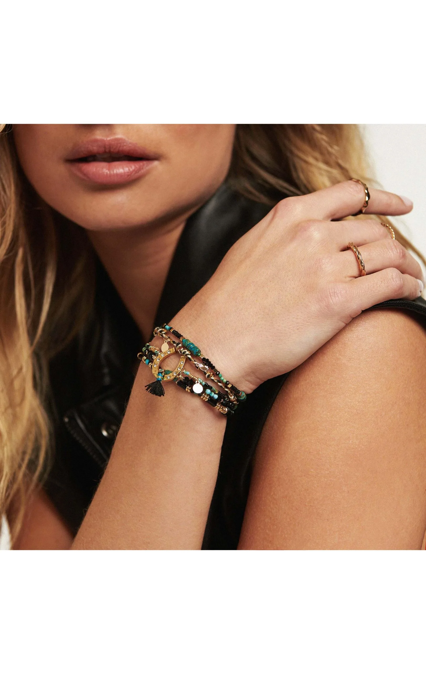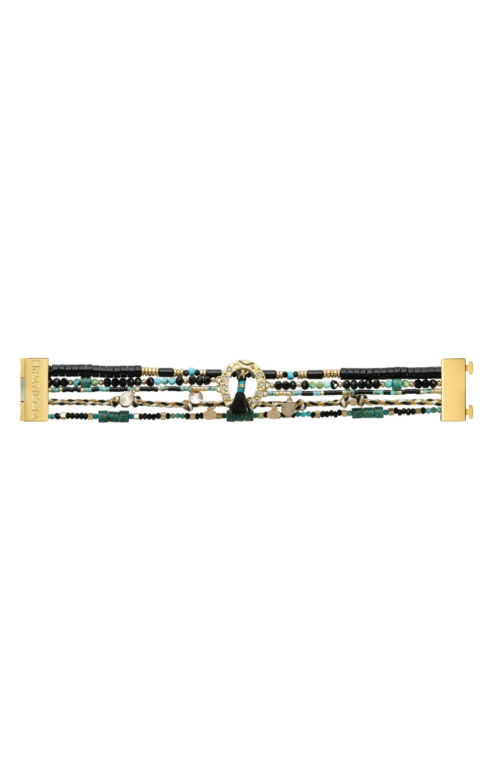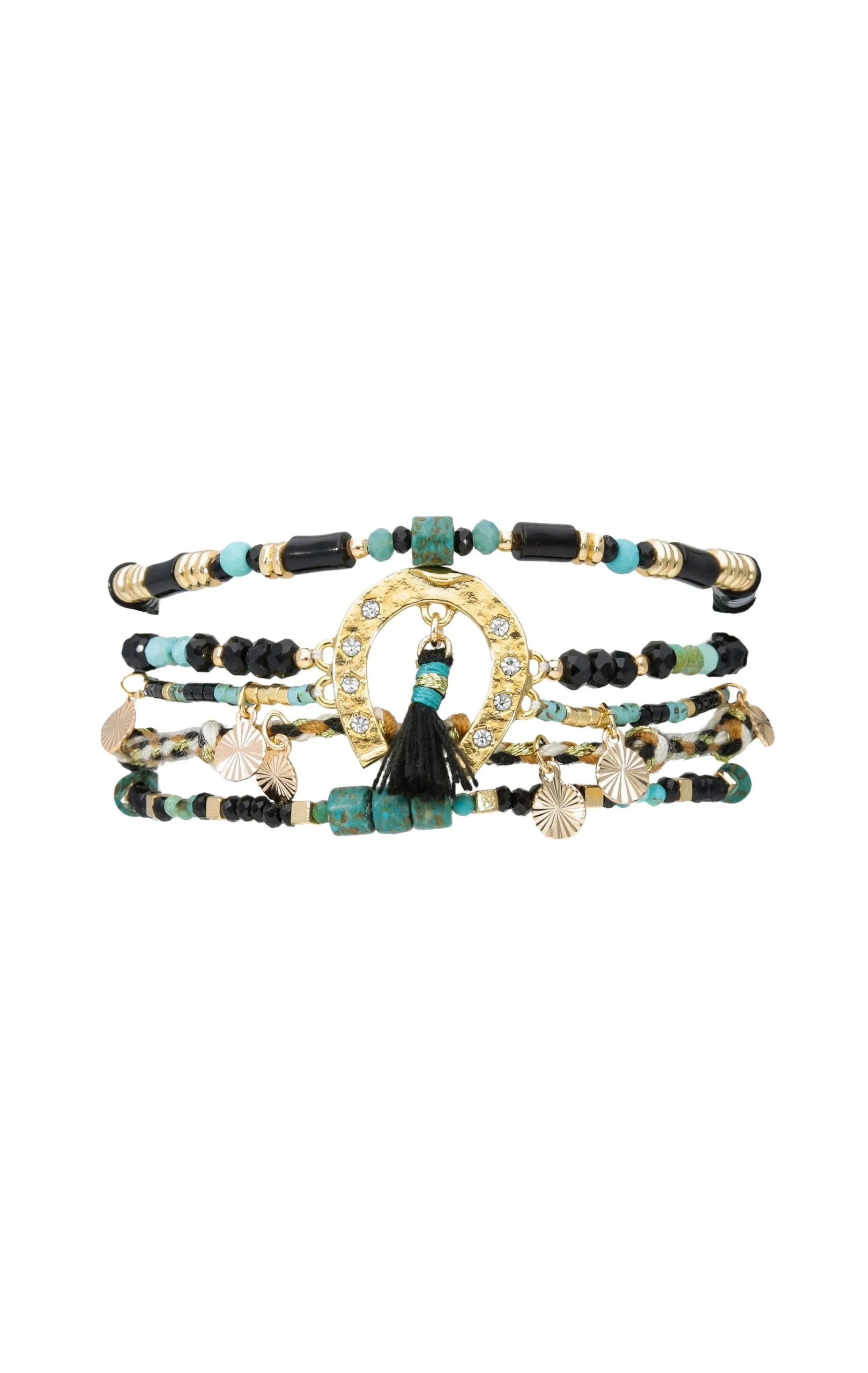 Année après année, nous vous proposons des manchettes toujours plus exceptionnelles! Ce bracelet dans les tons turquoise, noir, doré, et vert jade est composé de six liens en pierres semi-précieuses et perles de verre réhaussées de multiples pampilles dorées à l’or fin 14 carats. Son style Navajo orné d’un fer à cheval porte-bonheur en son centre, sera votre bijou fétiche cette saison. Vous allez adorer son esprit ethnique chic.