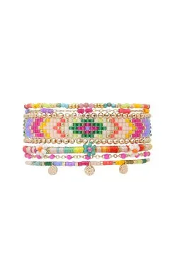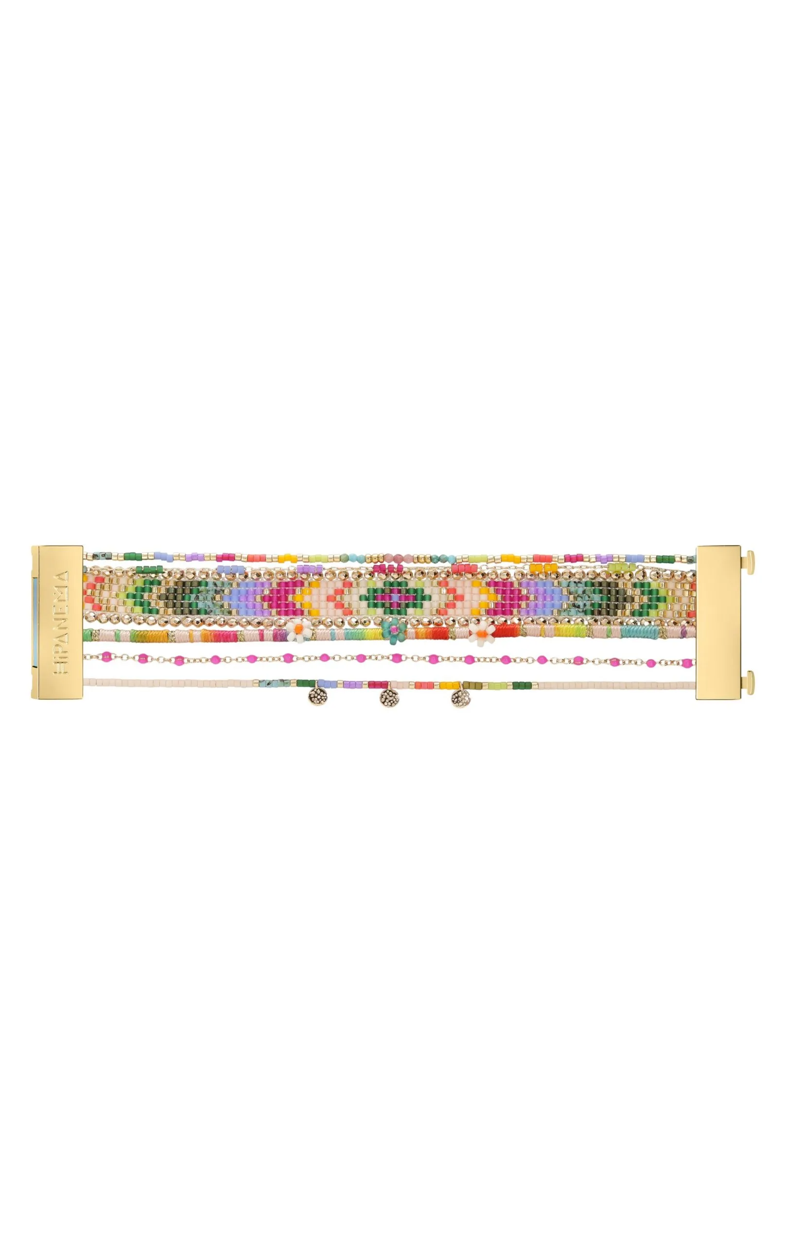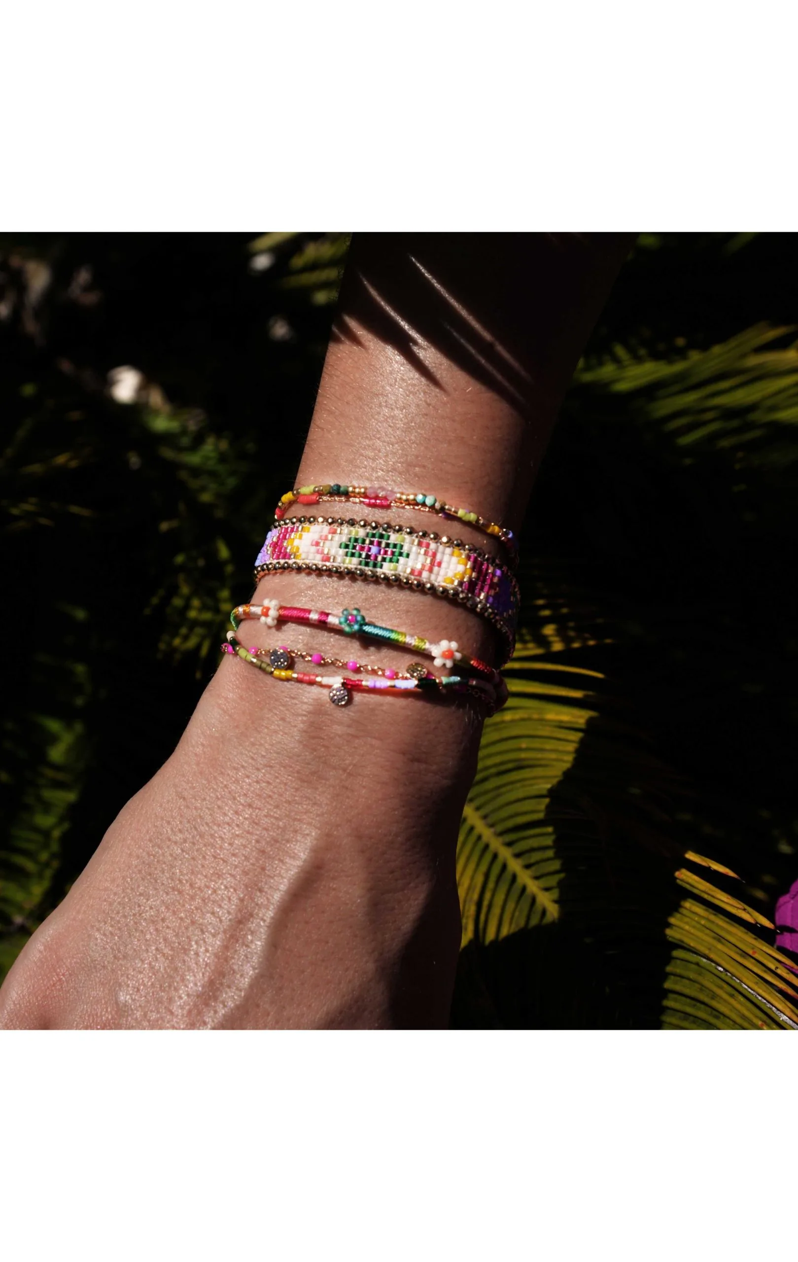 Attention, bracelet culte! Manchette cossue arc-en-ciel qui reprend tous les codes de ce thème Navajo en mode rainbow, avec un premier lien en perles multicolores, rythmé de différentes perles avec des perles facettées dans des tons bleu, vert, violet, fuchsia, rose, rouge. On retrouve une chaîne forçat ornée de perles Miyuki colorées. L’élément central est un tissage de perles de verre où l’on reprend un chevron très Navajo, emblématique d’Hipanema, dans des tonalités arc-en-ciel, jaune, rose clair, fuchsia, bleu marine, turquoise, Bleu Klein. Suivi d’un lien tissé dans les mêmes tonalités, rebrodé de marguerites. Pour finir, un lien en perles de rocailles où s’intercale du turquoise, du bleu, du violet, du rose, du vert, avec une élégante accumulation de sequins dorées à l’or fin. Ce bijou est fait à la main.