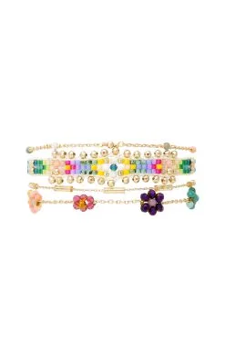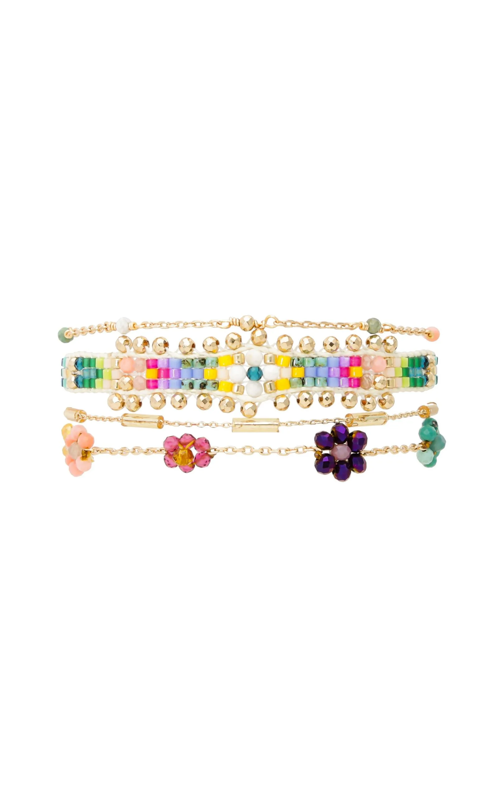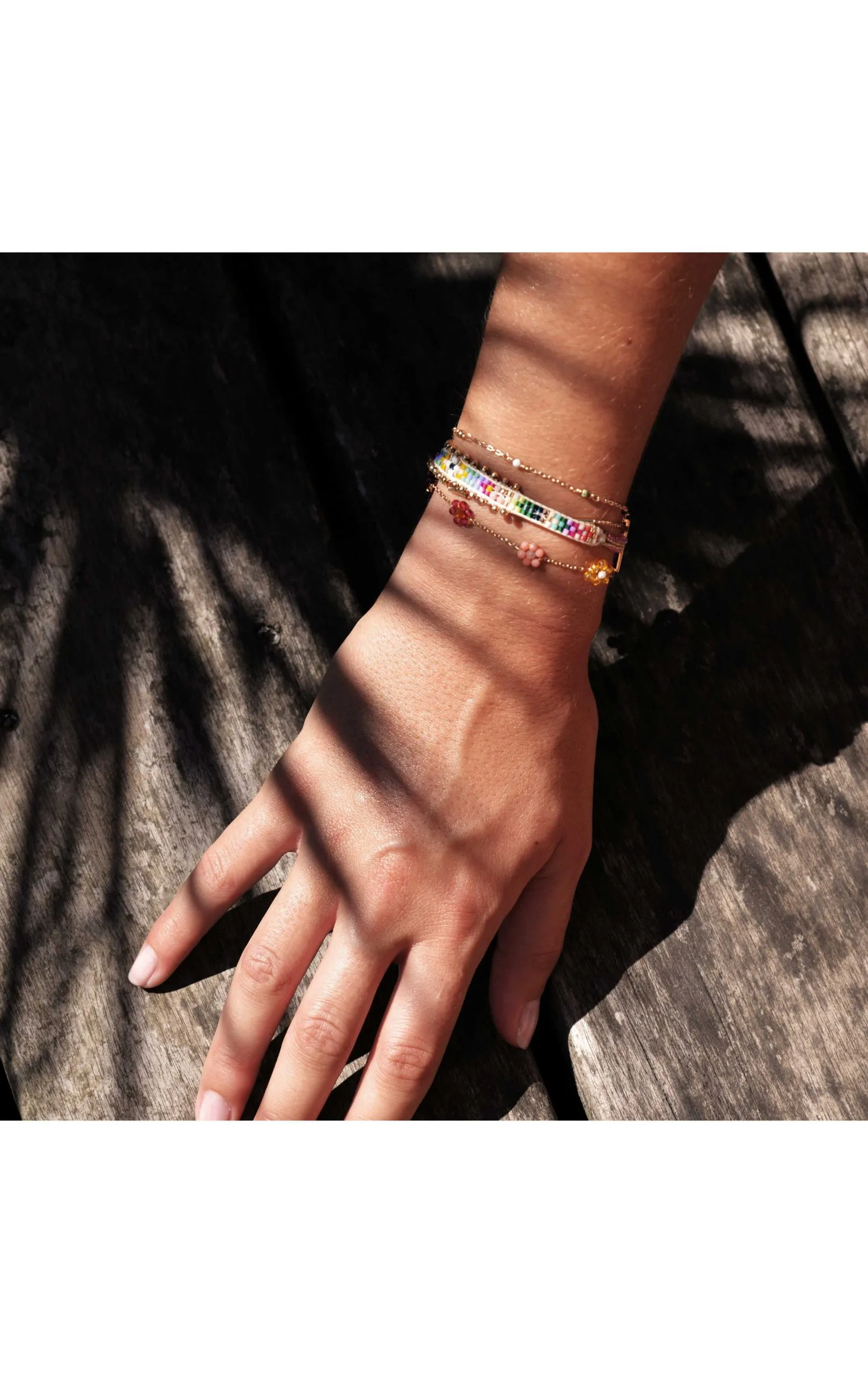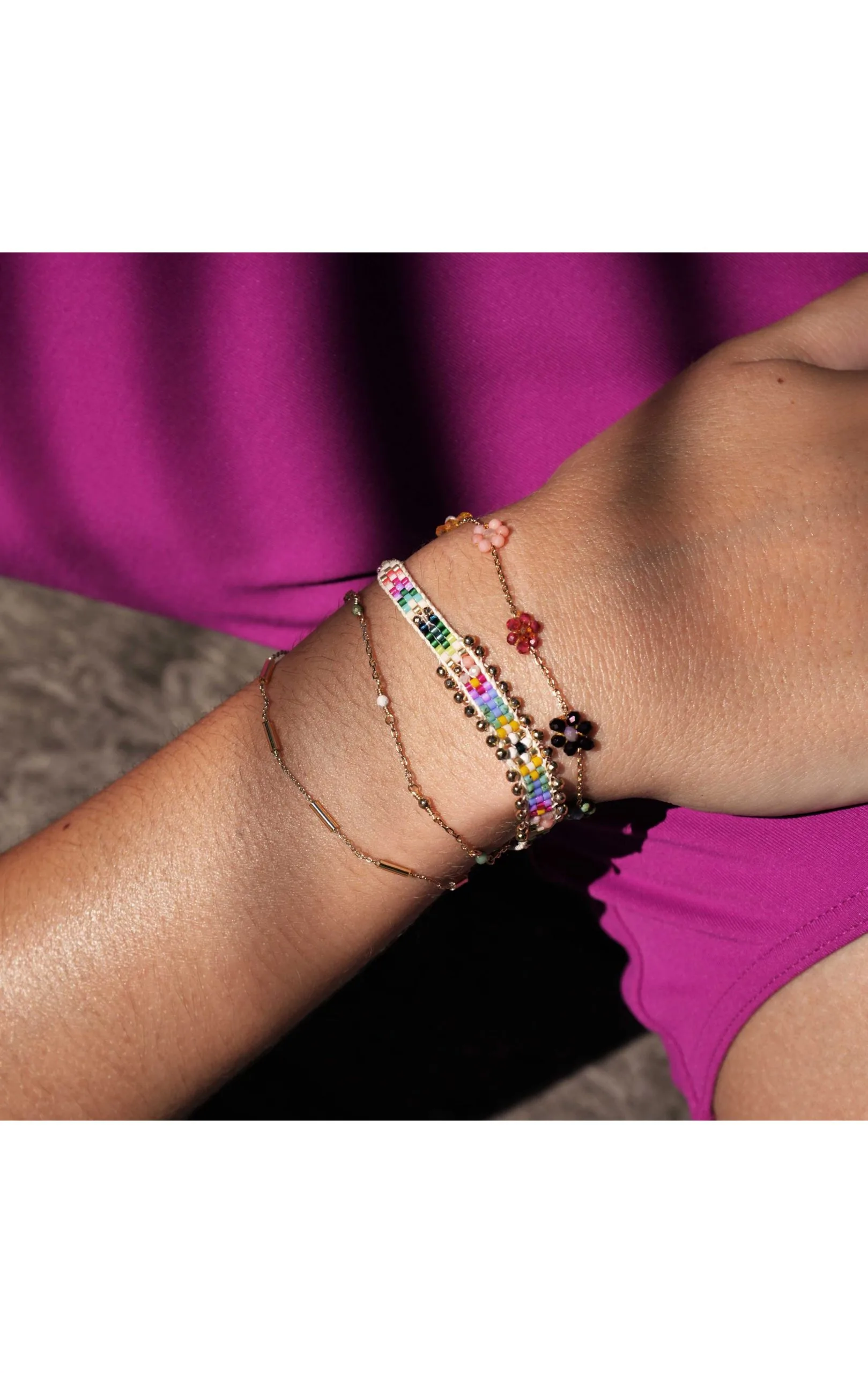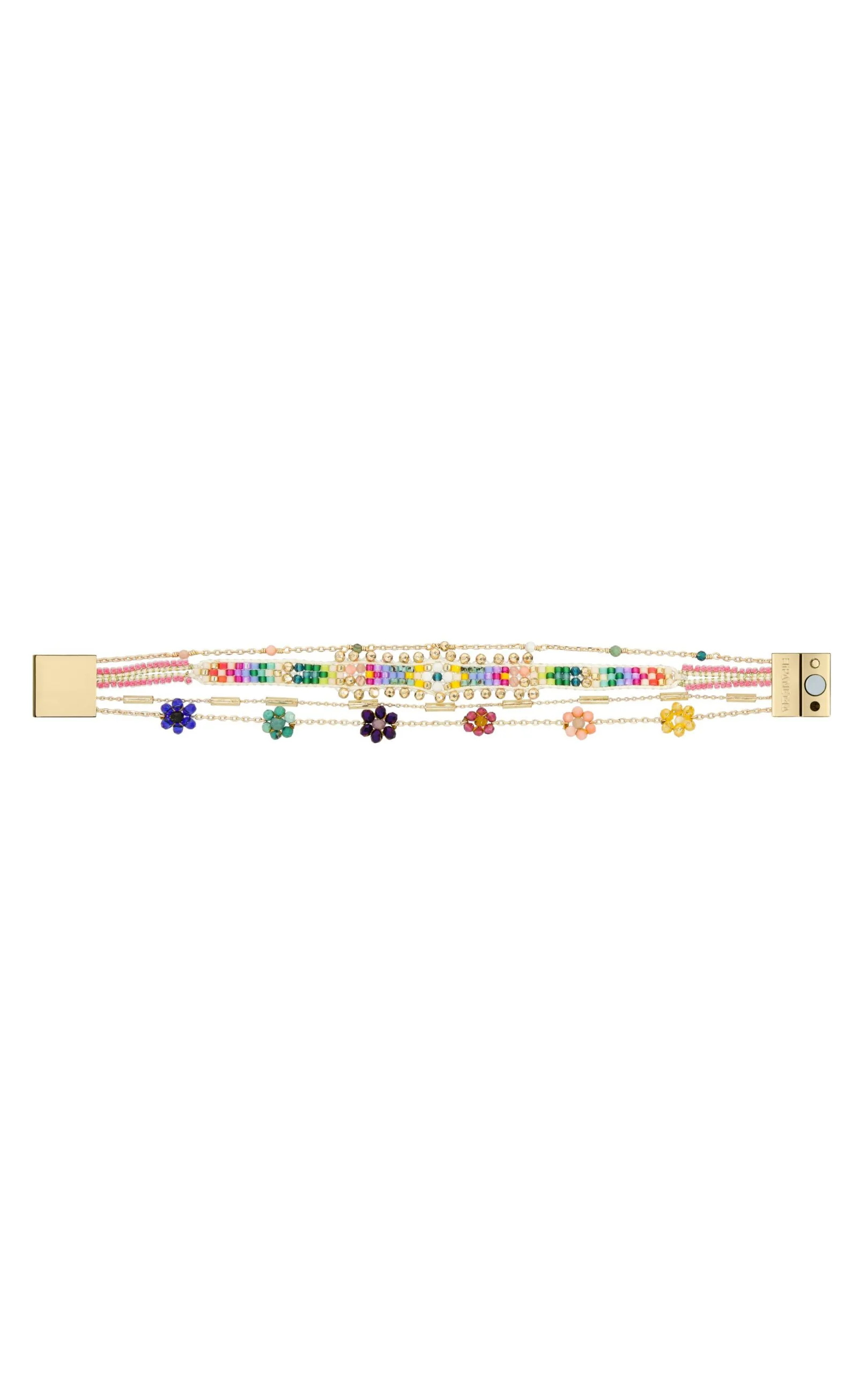 Petite manchette fine composée de quatre liens, au fermoir aimanté, et aux chaînes et pampilles dorées à l’or fin 18 carats. On découvre ainsi une petite chaîne chapelet dans des tons dorés avec des perles semi-précieuse multicolores, puis un lien tissé au tissage atypique en son centre, mêlant perles de rocaille multicolores et pierres semi-précieuses hématite, corail, turquoise, grenat, turquoise blanc, obsidienne, suivi d’une chaîne forçat fine intercalée de perles de verre en tubes, ainsi qu’une petite chaîne forçat sur laquelle sont brodées de petites marguerites en perles facettées de verre, dans des tons jaune, rose clair, fuchsia, bleu marine, turquoise, Bleu Klein. La manchette parfaite, et faite à la main, pour faire vibrer l’été à votre poignet.