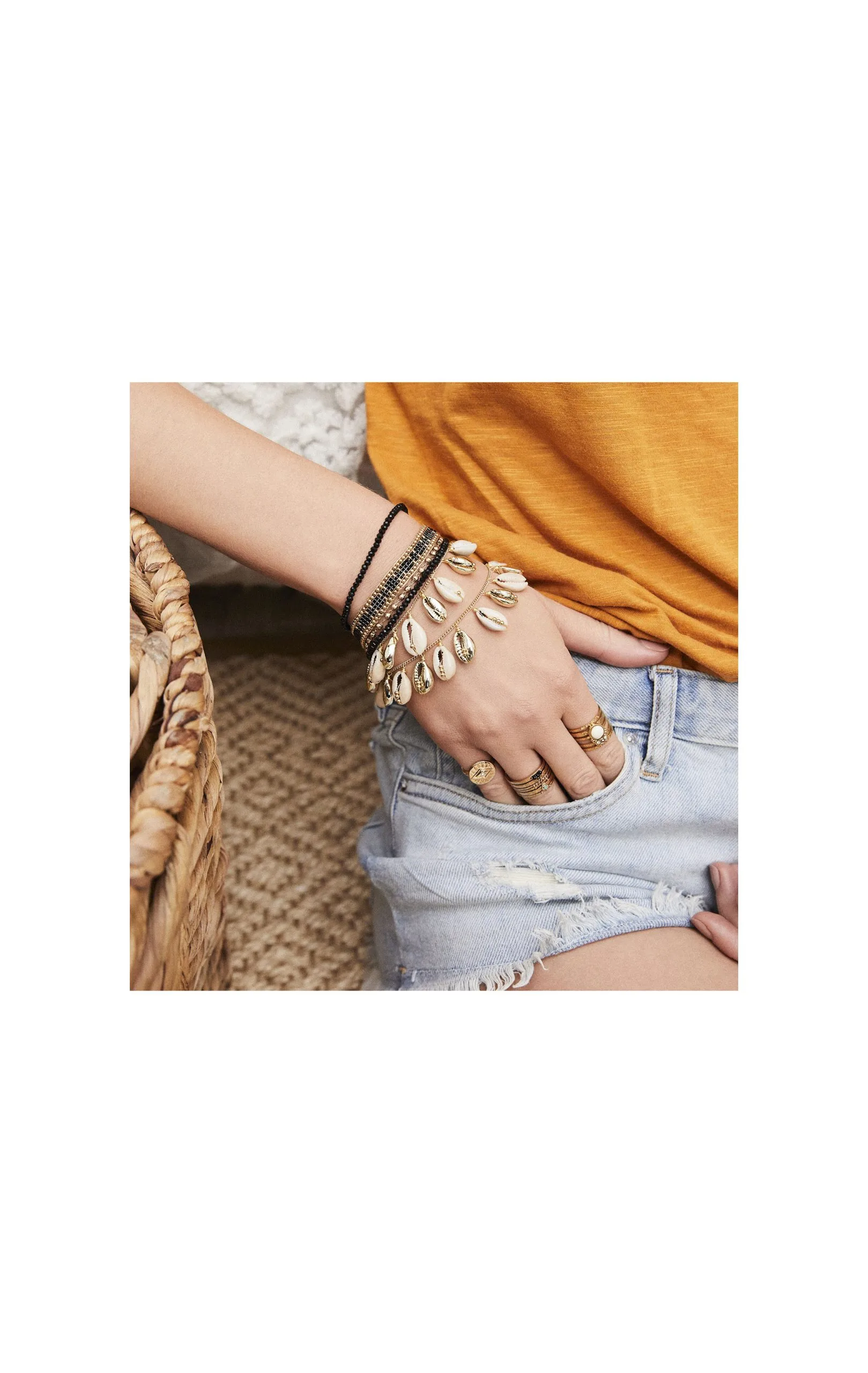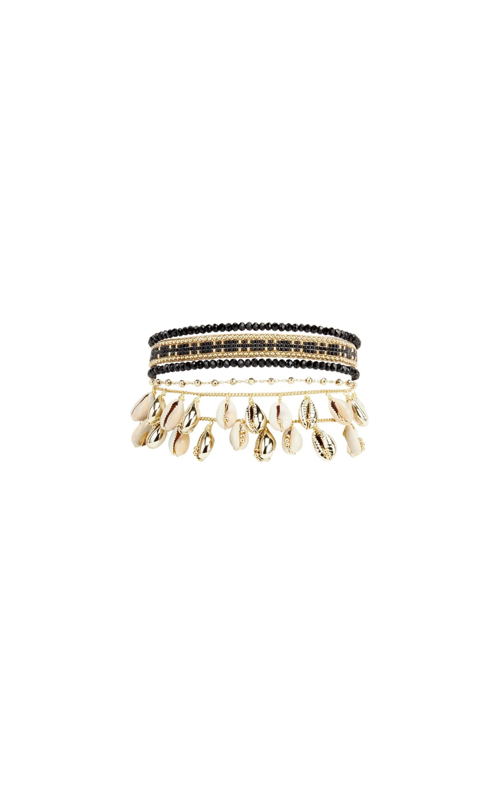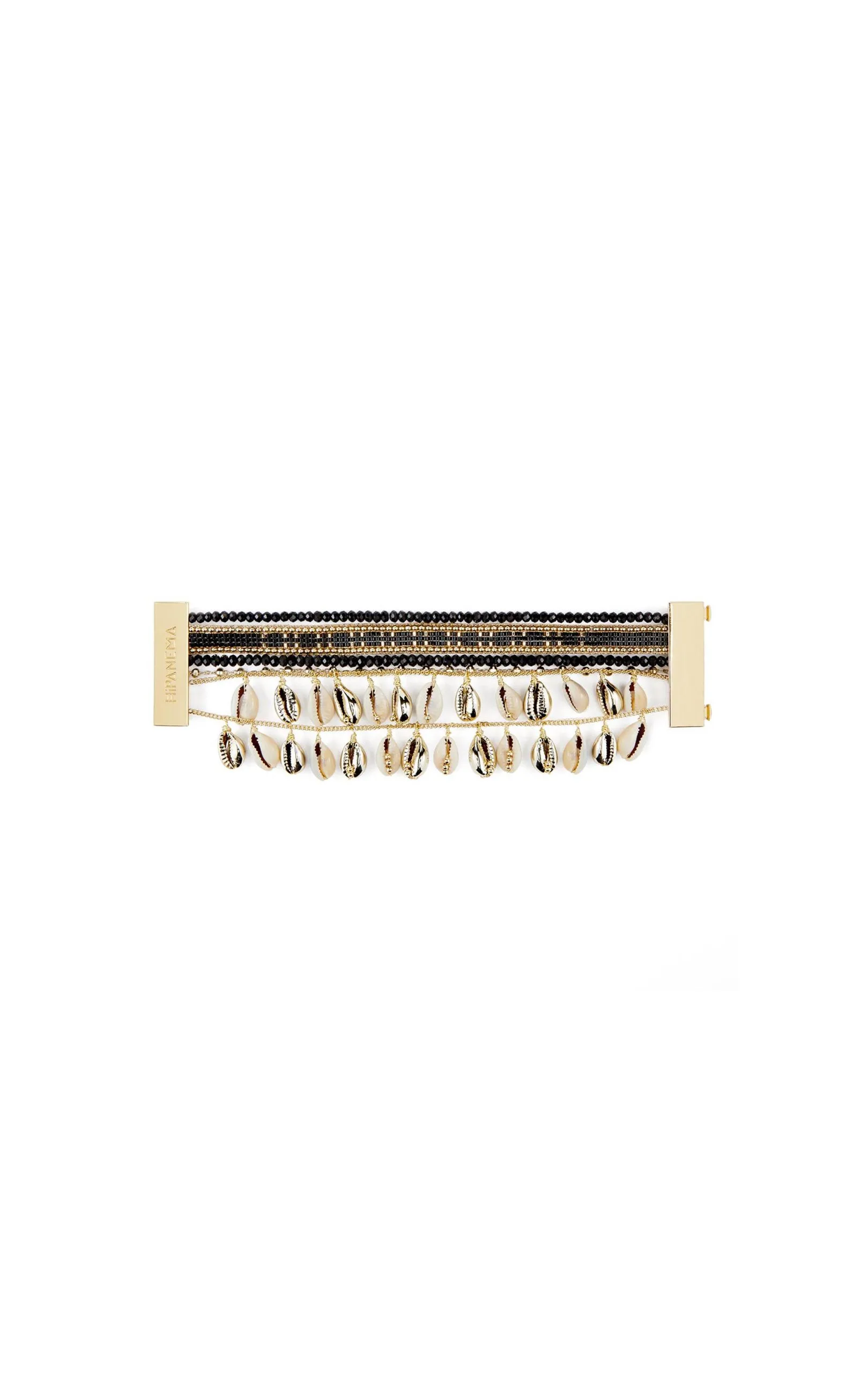 Splendide manchette multi-liens ornée de ravissants coquillages cauri et munie d’un fermoir doré aimanté. Ce bracelet est composé de chaînes dorées à l’or fin 14 carats, de perles tressées noires.