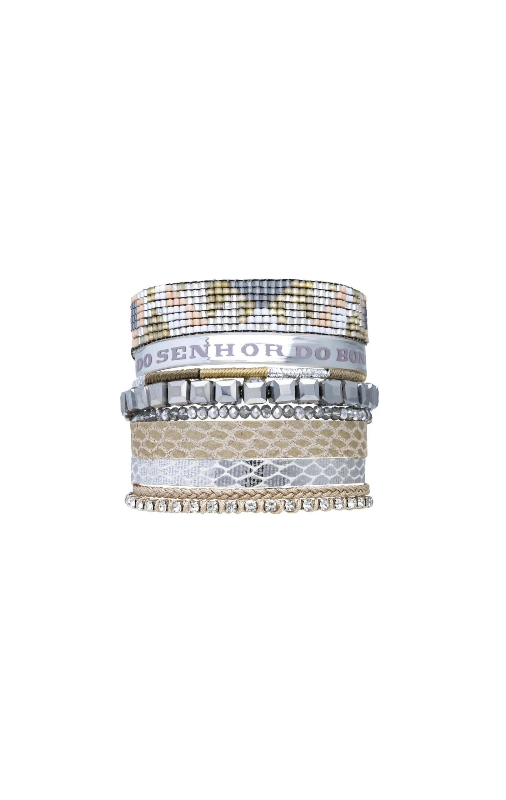 Cette large manchette avec un fermoir aimanté argenté est composée de multiples liens brésiliens et en perles du japon tressées. Une composition originale si chère à Hipanema dans les tons gris et nude.