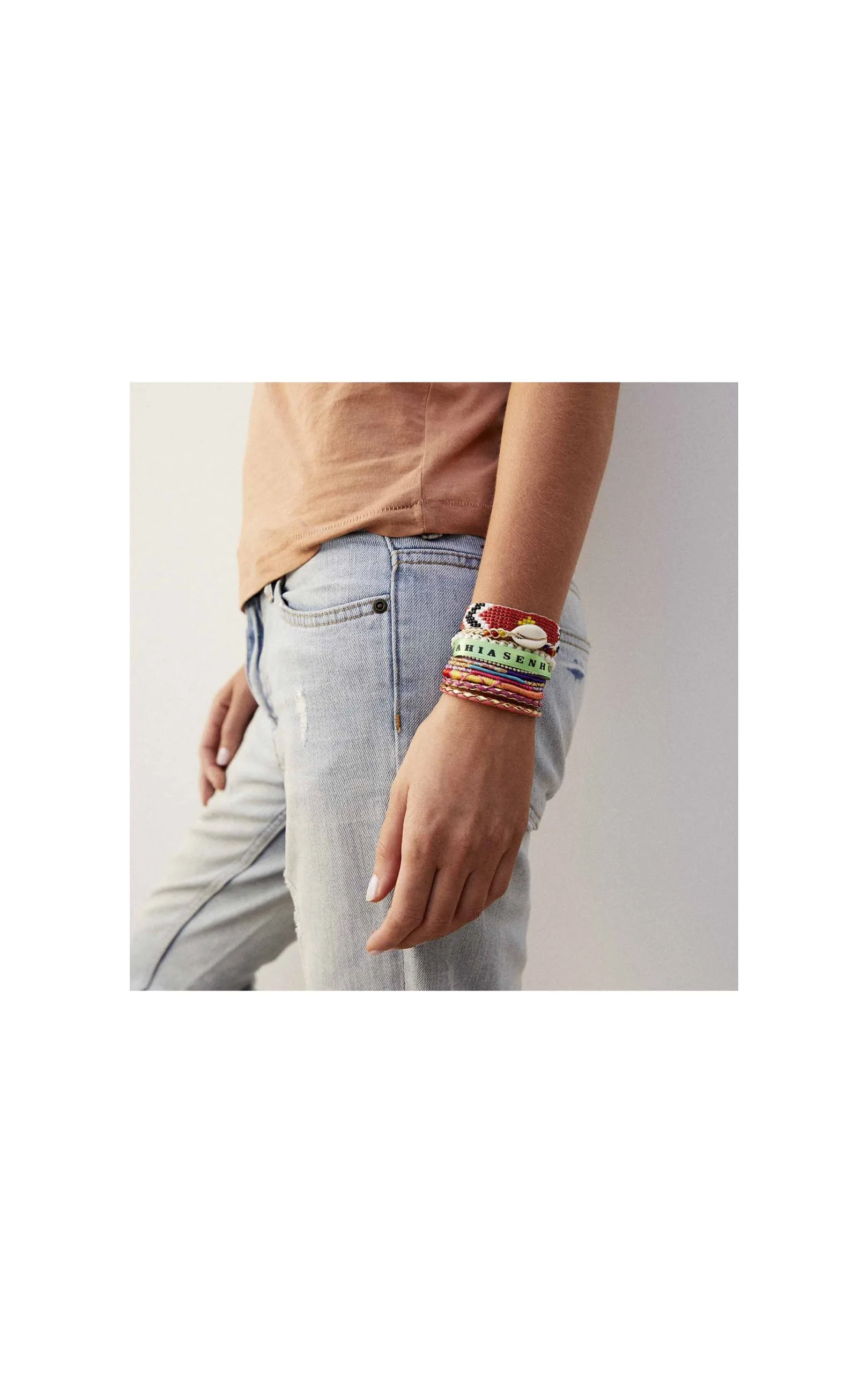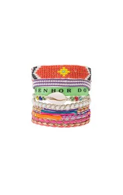 Ici est présenté la manchette “Version 02”, composée de liens de coton multicolores, d’un bracelet brésilien en perles orange, blanc et noir, d’un coquillage cowrie et du légendaire ruban sehnor da bonfim porte-bonheur.